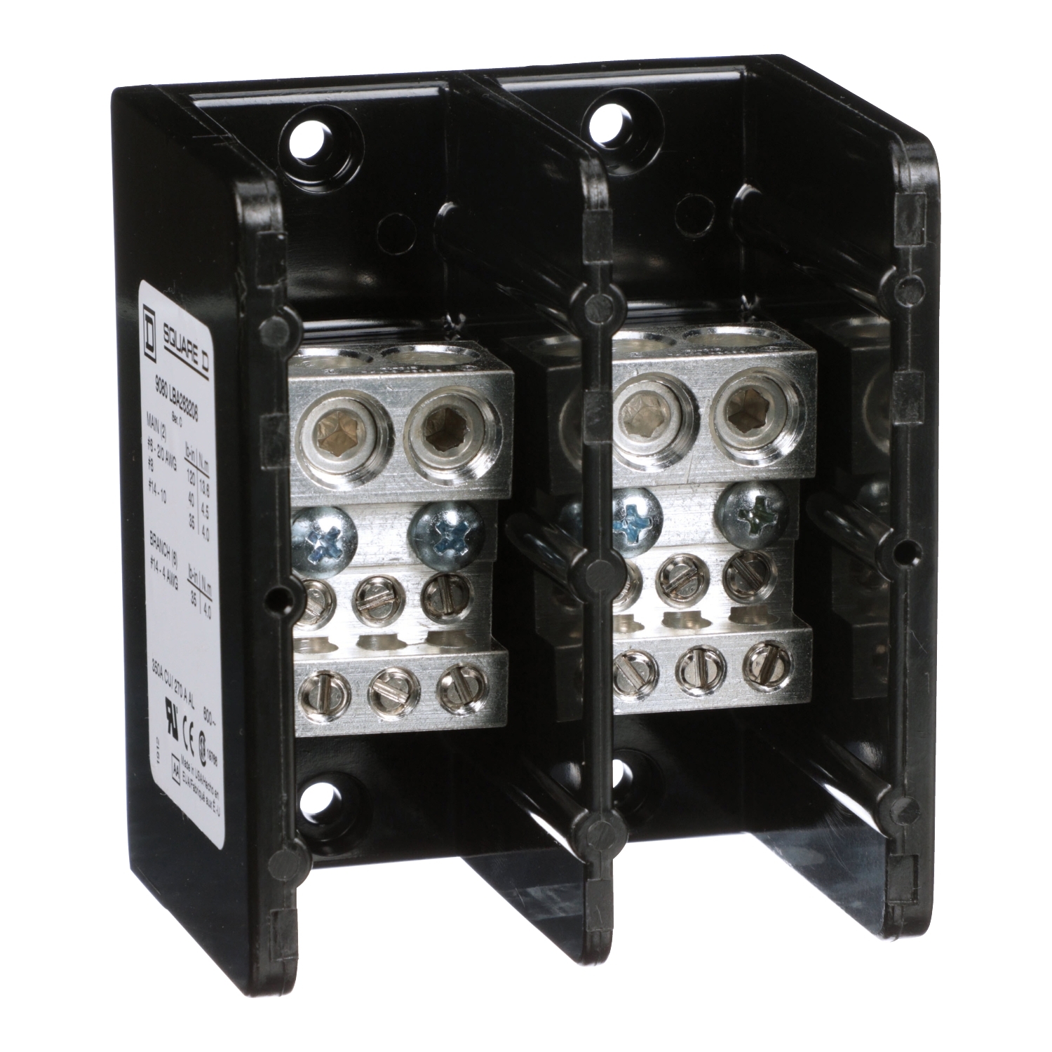 I blocchi di distribuzione dell'alimentazione Linergy sono progettati per cavi di terminazione e sono conformi agli standard NEMA. Questo blocco a due poli ha due aperture per i connettori sul lato linea (principale) e sei aperture per i connettori sul lato carico (derivazione). I capocorda laterali della linea accettano una #da 14 a 2/0 fili di rame o alluminio. Ogni capocorda del lato carico è in grado di accettare uno #da 14 a #4 fili di rame o alluminio. I capicorda sono in alluminio. I connettori hanno valori nominali di 350 ampere con cavo in rame e 270 ampere con cavo in alluminio. I connettori hanno un valore nominale di 600 V. L'alloggiamento è di tipo fenolico generico. Questi blocchi di distribuzione dell'alimentazione Linergy sono omologati UL per componenti e certificati CSA.