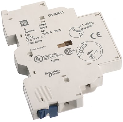 Blocco di contatti ausiliari TeSys GV, per interruttori per motori GV2 e GV3. Contatti ausiliari istantanei 1NO+1NC. Valore nominale per funzionamento fino a 6A/ 690V AC e 6 A/240V DC. Da installare sul lato sinistro dell'interruttore (2 blocchi possibili), collegamento mediante morsetti a vite. Certificazione secondo diverse norme (IEC, UL, CSA, CCC, EAC),