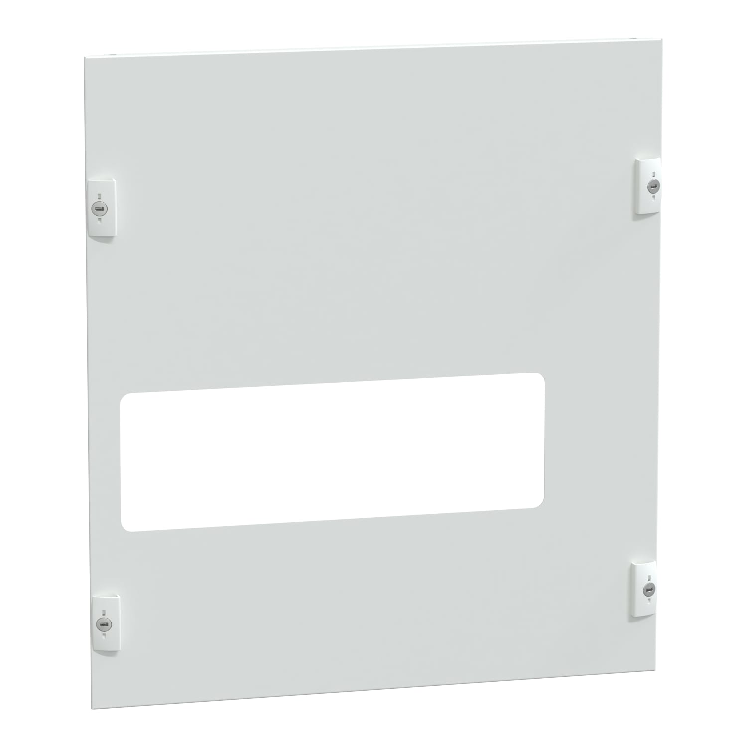 PrismaSeT P front plate for Transfer Pact 630A, 3P/4P. Type of front plate is cut-out plate. Number of device per horizontal rows is one, with vertical 11 modules. To be part of a PrismaSeT P vertrcal mounted front plate. for floor-standing enclosure - width 650/650 + 150 mm depth 400 mm. Front plate made with Epoxy powder coat treated sheet steel. matt/textured surface finition with white (RAL 9003). Ambient air temperature for operation is from 25 to 55 °C conforming to IEC 61439-1/ IEC 61439-2.