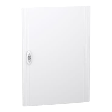 This PrismaSeT XS door is a plain door. It is designed to be compliant with an enclosure with 3 rows of 18 modules of 18mm. The IP degree of protection is IP40. The door is made of technoplastic. Its color is white (RAL 9003). The door is intented in residential or tertiary sectors. The door can be installed on flush or surface enclosure. it can be mounted and opened on the right or the left side of the enclosure. The total dimensions are (W) 426mm x (H) 600mm x (D) 20mm. The door is made from technoplastic. The resistance of the plastic to flames and to abnormal heat is 650°C. The IK degree of protection is IK09. The operating temperature is -25°C to 60°C.