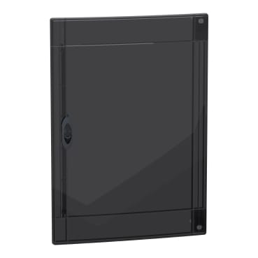 This PrismaSeT XS door is a transparent door. It is designed to be compliant with an enclosure with 3 rows of 18 modules of 18mm. The IP degree of protection is IP40. The door is made of technoplastic. Its color is smoked. The door is intented in residential or tertiary sectors. The door can be installed on flush or surface enclosure. it can be mounted and opened on the right or the left side of the enclosure. The total dimensions are (W) 426mm x (H) 600mm x (D) 20mm. The door is made from technoplastic.The resistance of the plastic to flames and to abnormal heat is 650°C. The IK degree of protection is IK09. The operating temperature is -25°C to 60°C.