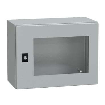 PanelSeT CRN - Cassetta in acciaio per montaggio a parete con porta trasparente. 300 x 400 x 200 mm. Cassetta compatta per montaggio a parete senza piastra di fondo. Porta reversibile in vetro (120°). Lati realizzati da un'unica sezione piegata. Parte posteriore saldata con doppio profilo a formare un'area sigillata protetta. Serratura a doppia barra da 3 mm. Corpo e porta in acciaio con vetro Securit® . Finitura superficiale in polvere epossidica a base poliestere. Grigio (RAL 7035). Grado di protezioneIP66 e IK08.