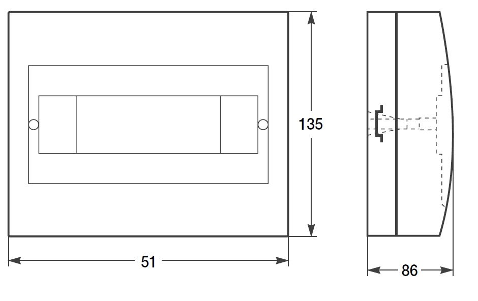 Centralini da parete IP40 per apparecchi modulari. CEI 23-48, CEI 23-49. Centralini senza porta bianco RAL 9003. Dimensioni: 135 x 51 x 86 mm. Potenza dissipabile : 8 W. Moduli da 18 mm: 2.
