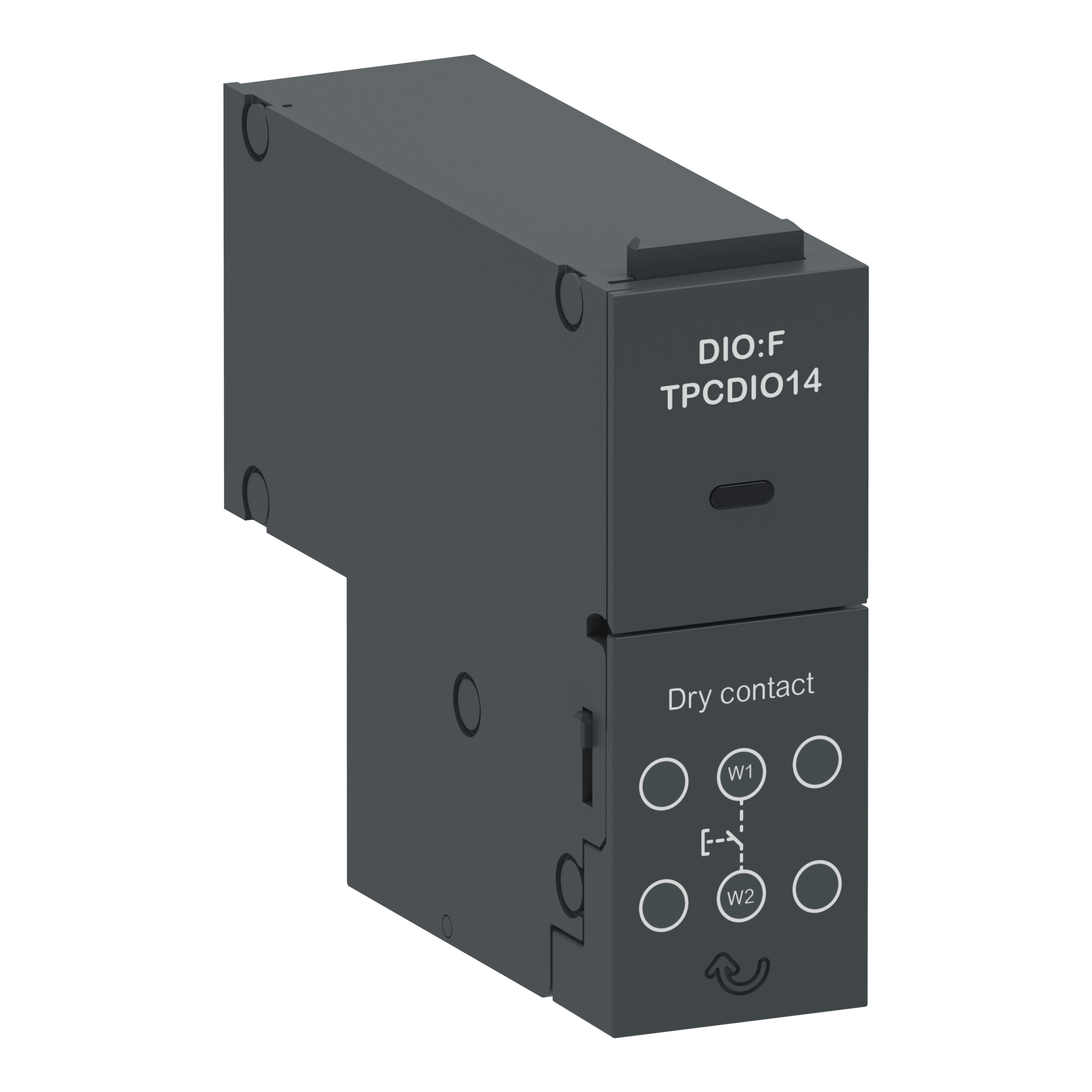 TPCDIO14 is input module as signalling accessory. It is provided 24VDC pulse signal for fire protection. The fire protection signal can transfer ATSE to off position when there is fire emergency and protect power continuity for crtical loads.