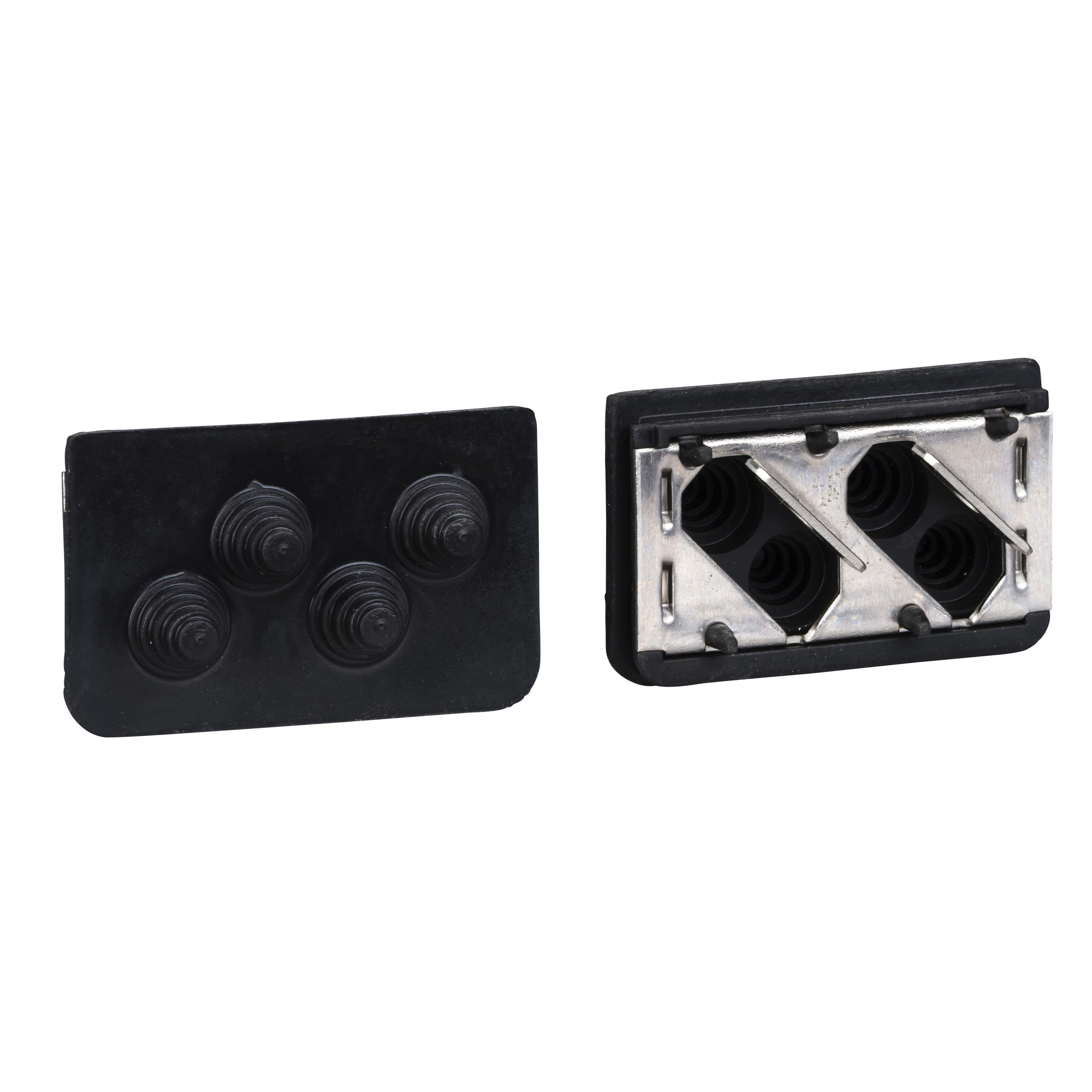 La piastra IP54 è proposta come opzione dei servoazionamenti integrati Lexium ILA, ILE e ILS. È costituita da una piastra con passacavi per 4 cavi di diametro da 3 a 9 mm. Per il variatore integrato sono necessarie 2 piastre. Forniscono la guarnizione, il fermo meccanico e il collegamento della schermatura. Viene venduto in confezioni da 10.