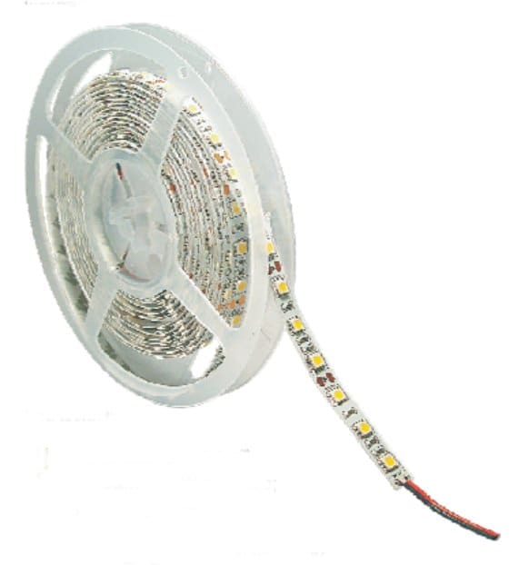 Bobina di striscia a LED ad alto flusso luminoso da 5m divisibile ogni 5cm. Alimentazione 12VDC. Consumo 14.4W/m. Fascio d'apertura 120°. Temperatura ambiente -25° a +50°C. Indice di Resa Cromatica (CRI) = 80. Assenza raggi UV. Durata di vita media 20.000h con il 70% del flusso iniziale a 2 tc 45°C. Bianco caldo. Lumen/m: 1080. Lux@1m: 215.