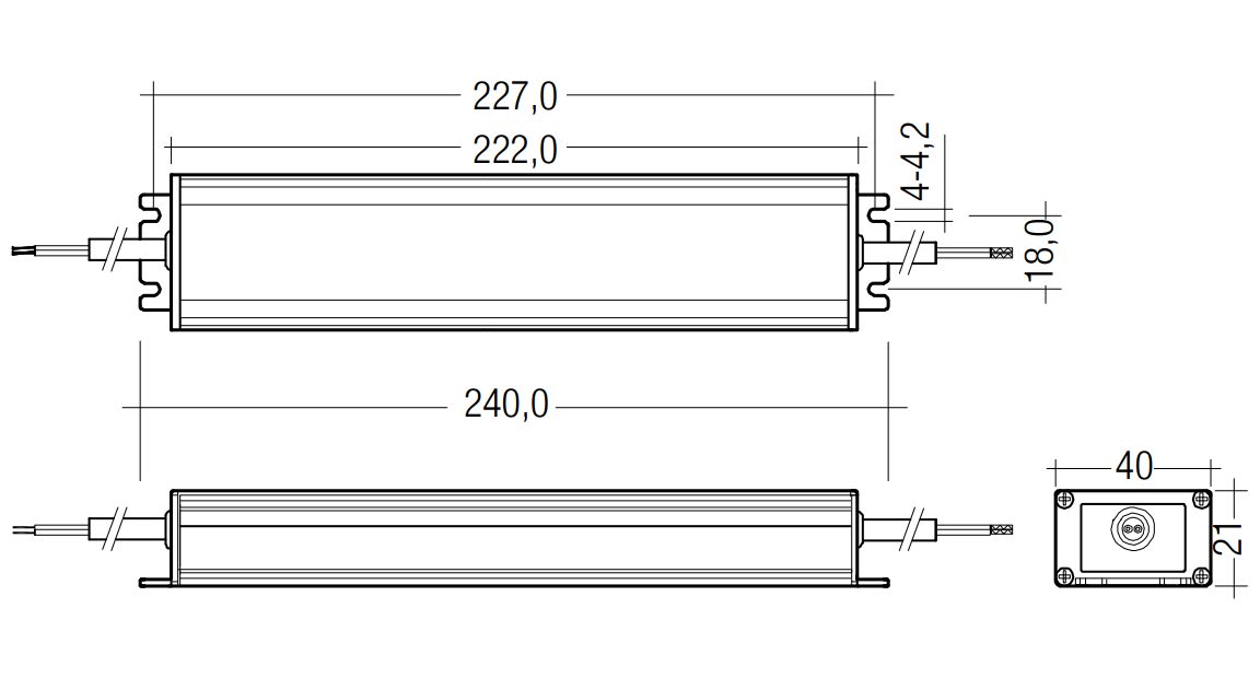 TALEXdriver LCU 60W 12/24V IP67 EXC . LED Driver a tensione costante. Tensione di alimentazione universale. Tensione in uscita costante. Collegamento: cavo con puntalini (lunghezza circa 500 mm). Identificatori di polarità sul secondario: + rosso / - nero. Copertura metallico, resinato. Durata vita nominale di max. 50.000 h (con ta 50 °C con un tasso di mal funzionamento ≤ 0,2 % per 1.000 h). 5 anni di garanzia.