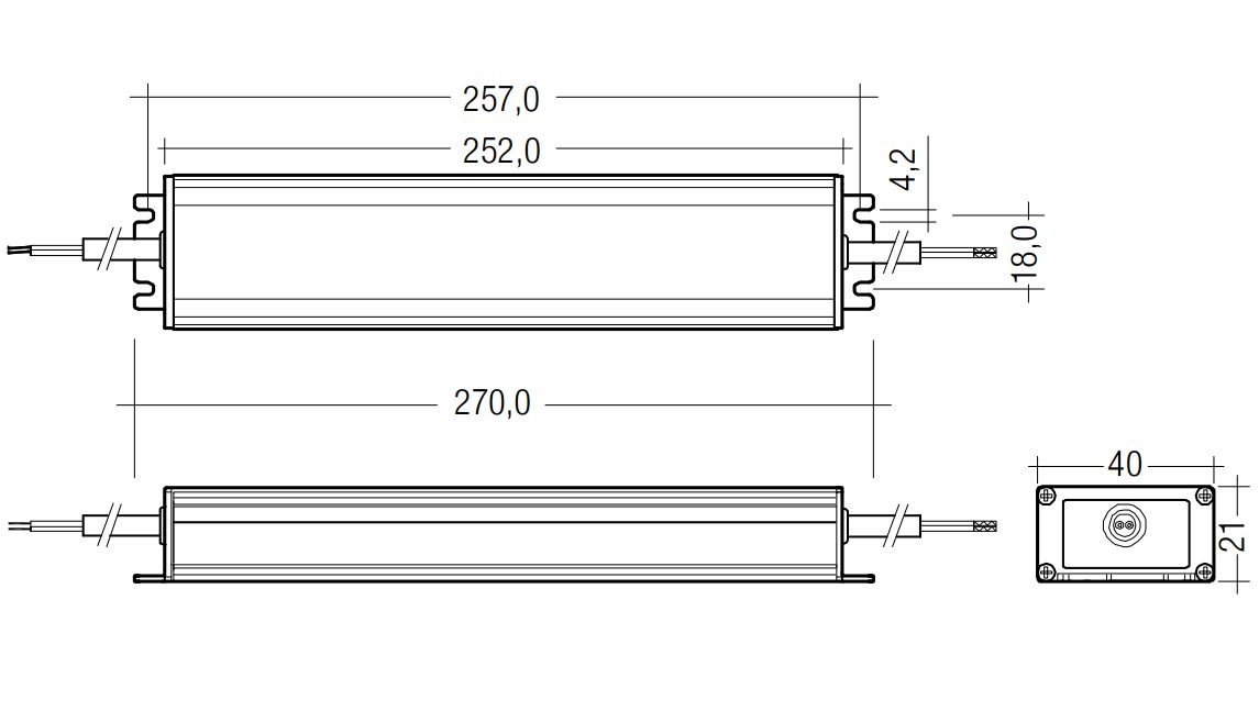 Descrizione del prodotto: LED Driver a tensione costante. Tensione di alimentazione universale. Tensione in uscita costante. Collegamento: cavo con puntalini (lunghezza circa 500 mm). Identificatori di polarità sul secondario: + rosso / - nero. Coperturametallico, resinato. Durata vita nominale di max. 50.000 h (con ta 50 °C con un tasso di mal funzionamento ≤ 0,2 % per 1.000 h). 5 anni di garanzia. Idoneo per unità illuminazione d'emergenza conf. EN 50172. Conforme alla CLASSE C in una gamma compresa tra il minimo ed il massimo carico in accordo alla EN 61000-3-2. Proprietà: Costruzione compatta. Elevata efficienza. Basse perdite di potenza. Protezione da sovratemperatura con riaccensione automatica. Protezione da sovraccarichi. Protezione contro ilcortocircuito con riaccensione automatica. SELV. Tipo di protezione IP67. Copertura di metallo .