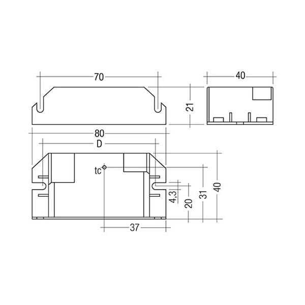 LC 10W 500mA fixC C SNC - LED Driver per moduli LED, versione dipendente ad uscitta fissa. LED Driver a corrente costante . Corrente d'uscita 500 mA. Potenza d'uscita max. 10 W. Efficienza fino al 83 %. Durata vita nominale di max. 50.000 h. Per apparecchi illuminanti in classe d'isolamento I e II. Protezione della temperatura in base alla EN 61347-2-13 C5e. 5 anni di garanzia . Copertura policarbonato bianco. Tipo di protezione IP20. Tensione in uscita 35 V. Potenza d'uscita 7 – 10 W. Dimensioni L x l xH: 80 x 40 x 21 mm.