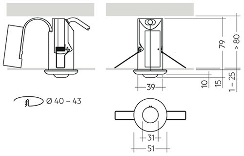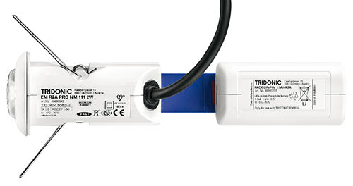 EM R2A BASIC NM 132 2W - Modulo LED per luce di emergenza, installazione diretta in soffitti. Set completo di elettronica, modulo LED, dissipatore, ottica e accumulatore. Contiene ottica multi-lenti click-in per illuminazione antipanico, di vie di fuga epresidi. Funzione luce di emergenza per test manuale. Foro soffitto ridotto, 40 – 43 mm di diametro, 80 mm di altezza. Potenza d'uscita 0,75 – 1,50 W. Consumi minimi in standby. Varianti per circuito permanente e in emergenza. 3 h di autonomia misurata (varianti separate). Plug-in accumulatore litio-ferro-fosfato con pressacavi. 5 anni di garanzia sull'elettronica (driver LED). 3 anni di garanzia sugli accumulatori. IP20/IK03. LED 2W 6500K.