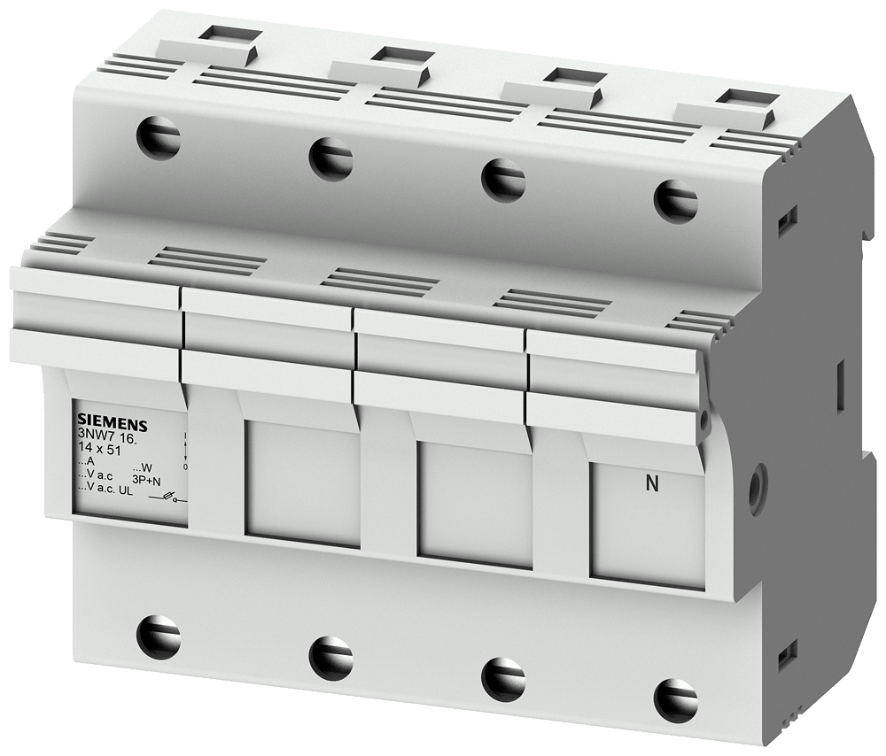 SENTRON, portafusibili per cartucce cilindriche, 14x51 mm, 3P+N, In: 50 A, Un AC: 690 V Portafusibili per cartucce cilindriche 3NW7 per il sistema di fusibili cilindrici SENTRON per la protezione impianto selettiva. I portafusibili e le cartucce fusibilicilindriche 3NW sono stati sviluppati per proteggere i componenti a semiconduttore. Soddisfano gli standard internazionali come IEC 60269, che li rende utilizzabili in tutto il mondo. Sono testati e approvati in Europa come sezionatori-fusibili, ma non sono previsti per la commutazione sotto carico. Dispositivi di protezione SENTRON - Una scelta sicura.