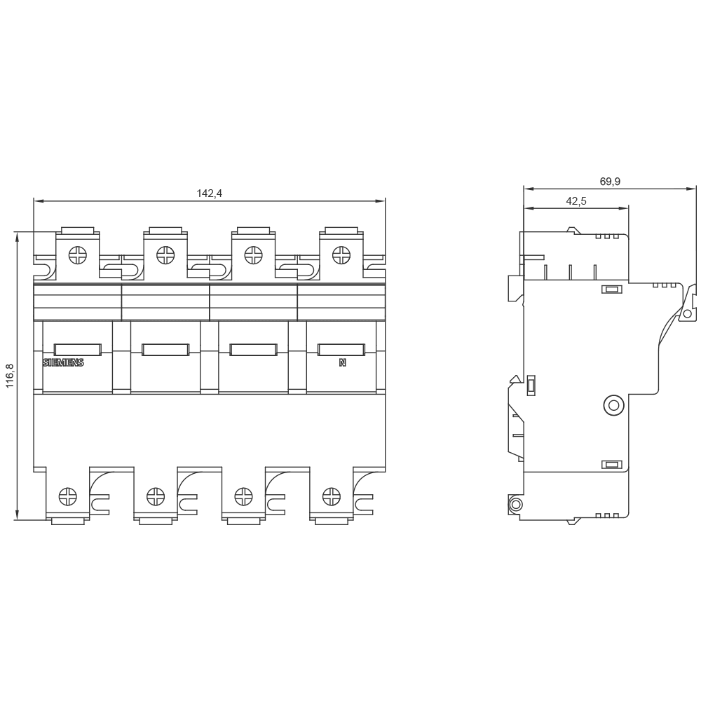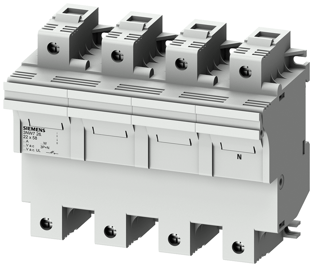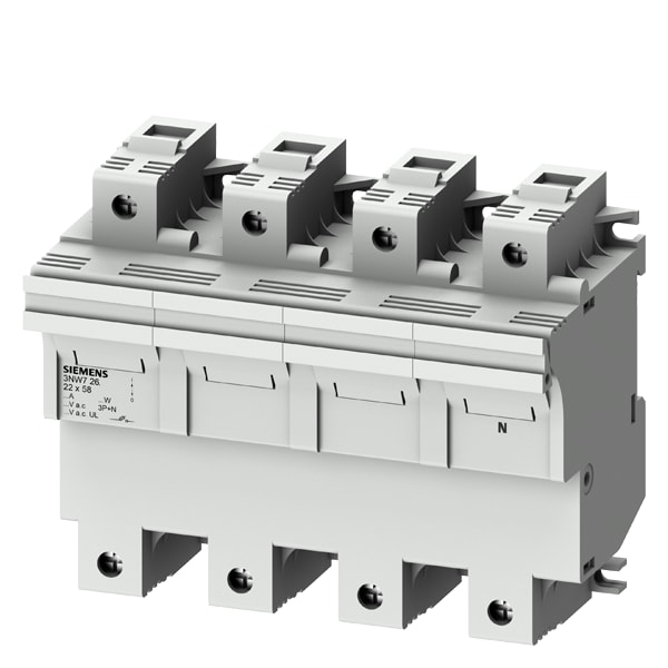 SENTRON, portafusibili per cartucce cilindriche, 22x58 mm, 3P+N, In: 100 A, Un AC: 690 V Portafusibili per cartucce cilindriche 3NW7 per il sistema di fusibili cilindrici SENTRON per la protezione impianto selettiva. I portafusibili e le cartucce fusibili cilindriche 3NW sono stati sviluppati per proteggere i componenti a semiconduttore. Soddisfano gli standard internazionali come IEC 60269, che li rende utilizzabili in tutto il mondo. Sono testati e approvati in Europa come sezionatori-fusibili, ma non sono previsti per la commutazione sotto carico. Dispositivi di protezione SENTRON - Una scelta sicura.