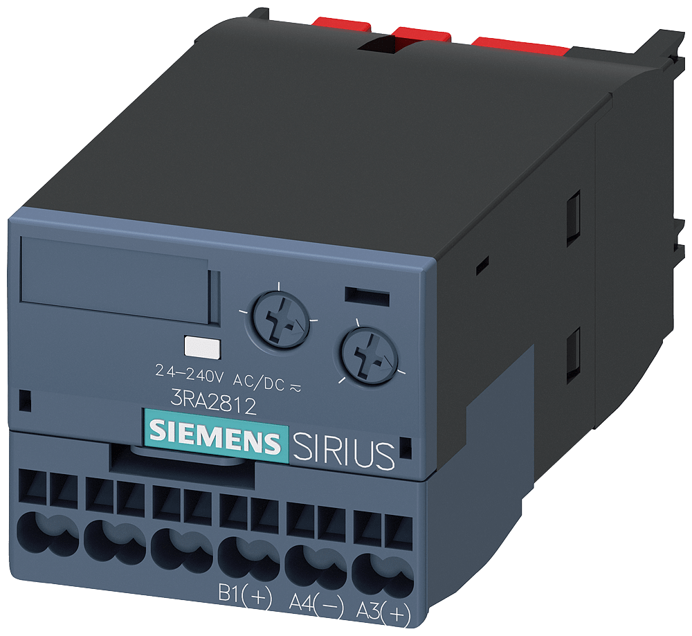 relè elettronico a tempo, ritardato alla diseccitazione, con segnale di comando e uscita statica, intervallo di tempo 0,05...100 s, AC/DC 24...240 V, 50/60 Hz, varistore per lo smorzamento delle bobine del contattore integrato, morsetti a molla, innestabile a scatto sul lato frontale per contattori 3RT201 / 3RT202 e contattori ausiliari 3RH2 modulo funzionale SIRIUS 3RA28 per avviamento diretto per il montaggio su contattori 3RT2 e contattori ausiliari 3RH2 per processi di commutazione ritardati in circuiti di comando, di avviamento, di protezione e di regolazione, ad es. per lavviamento di motori in cascata o il comando di post-funzionamento di ventole. Linserimento semplice e senza attrezzi consente la realizzazione di funzioni di temporizzazione indipendenti dallapparecchiatura di comando senza cablaggio addizionale. Si escludono così gli errori di cablaggio e si riducono i costi di collaudo. Grazie al montaggio frontale agli apparecchi si risparmia posto sulla guida DIN. Una circuitazione di protezione aggiuntiva non è necessaria. Gli apparecchi sono impiegabili in tutto il mondo grazie ad approvazioni internazionali (ad es. IEC, CCC, UL/CSA). I moduli funzionali sono fornibili per contattori 3RT2 e contattori ausiliari 3RH2 nelle grandezze costruttive da S00 a S3. Disponibili con un ampio campo di tensione AC/DC 24-240 V, uscite a scelta1 NO + 1 NC o 1 CO e con morsetti a vite o a molla. Per i moduli funzionali sono disponibili kit di cablaggio e una copertura piombabile. Relè SIRIUS - un programma per ogni evenienza.