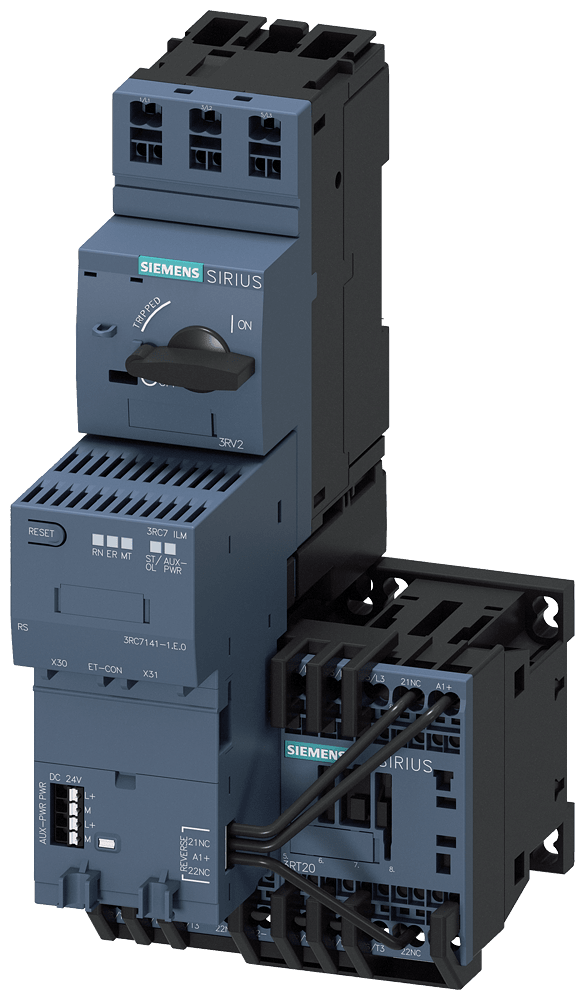 partenza motore intelligente partenza motore intelligente avviatore invertitore standard 0,4 ... 4 A fino a AC 690 V tipo di coordinamento 2 grandezza costruttiva S00 per sistema ET 200SP comprendente 3RC7141-1EE00, 3RV2311-1EC20, 2x 3RT2017-2BB42 Partenza motore intelligente SIRIUS 3RA8 come parte integrante dellautomazione con SIMATIC ET 200SP per la protezione e lavviamento di motori. La partenza motore intelligente 3RA8 è costituita da un interruttore automatico premontato, un contattore adatto e un modulo di collegamento intelligente (Intelligent Link Module, ILM) 3RC7. Il rilevamento diretto di valori di misura e informazioni di stato consente la trasparenza fino nel livello di campo. La funzione di sovraccarico integrata e il riconoscimentodi guasti, deviazioni e manutenzione necessaria facilitano la diagnostica e consentono una manutenzione preventiva. La notevole riduzione dellonere di cablaggio, la semplicità di montaggio nel quadro elettrico e la parametrizzazione in TIA Portal consentono di risparmiare tempo durante la messa in servizio e gli ampliamenti. Le partenze motore intelligenti 3RA8 sono disponibili come avviatori diretti e avviatori invertitori per diversi campi di corrente, come variante sia Standard che High Feature e tra laltro con misura della tensione e della potenza. Come accessori sono disponibili ad es. adattatori per montaggio separato, Power Cable e Communication Cable. Moduli di collegamento intelligenti 3RC7 - Semplicemente digitali. Intelligenti sotto vari aspetti.