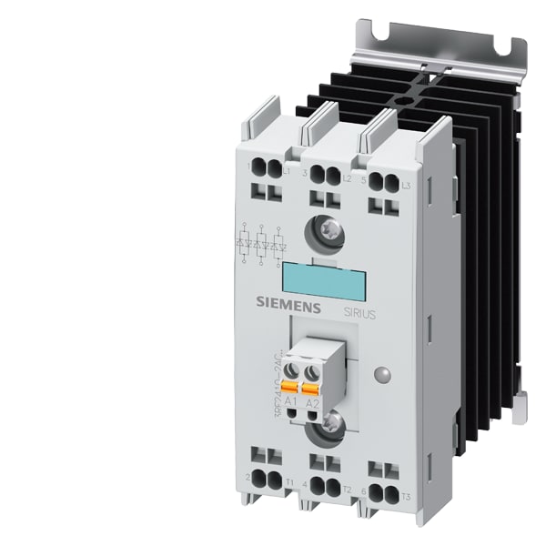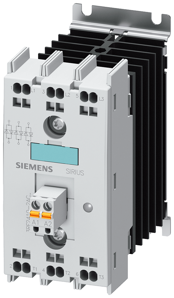 Contattore statico trifase 3RF2 AC 51 / 10 A / 40 °C 48-600 V / DC 4-30 V a comando trifase morsetto a molla tensione di interdizione 1200 V contattore statico SIRIUS 3RF24 per il comando di carichi ohmici/induttivi, ad es. di elementi riscaldanti o di valvole in un impianto di imbottigliamento. La commutazione silenziosa e senza usura degli apparecchi li rende ideali per limpiego in ambienti sensibili al rumore (uffici, ospedali). Essi sono estremamente affidabili anche in caso di frequenze di commutazione elevate. Poiché il dissipatore di calore è già integrato, è possibile linstallazione diretta nel quadro elettrico. La forma costruttiva compatta fa risparmiare spazio sulla guida DIN. I contattori statici possono essere inoltre ampliati mediante moduli funzionali standardizzati 3RF29 per molteplici applicazioni con un semplice montaggio a scatto. Gli apparecchi hanno omologazioni internazionali (ad es. IEC e UL/CSA). I contattori statici sono disponibili come apparecchi monofase o trifase. Essi sono fornibili per diverse potenze e tensioni nominali di impiego. Progettati per comando in AC o DC, essi sono disponibili con morsetti a vite, a molla o per capicorda ad occhiello. Come accessori sono disponibili oltre ai moduli funzionali 3RF29 anche spine di controllo e calotte coprimorsetti. Semplice, efficiente, sempre attuale - il sistema modulare SIRIUS.