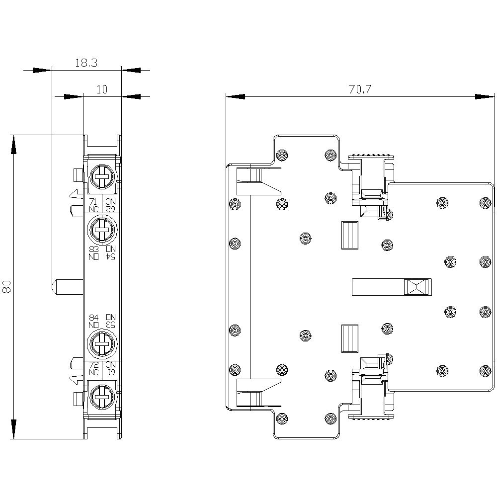 secondo blocchetto di contatti ausiliari laterale, 1 NO 1 NC, morsetti a vite, per contattori 3RT1 contatto ausiliario SIRIUS 3RH19 per lampliamento dei contatti ausiliari nel circuito di comando. Questo blocchetto di contatti ausiliari 3RH19 può essere montato senza attrezzi sui contattori 3RT1 delle grandezze costruttive S0-S12. I blocchetti di contatti ausiliari 3RH19/3RH29 sono fornibili come varianti per il montaggio frontale o laterale, con fino a quattro contatti NO con commutazione istantanea o fino a due contatti NO e NC anticipati. I blocchetti di contatti ausiliari possono essere in esecuzione con elementi di contatto a guida forzata in contattori ausiliari 3RH o anche come contatti speculari in contattori di potenza 3RT. Essi sono sempre fornibili con morsetti a vite e morsetti a molla. Semplice, efficiente, sempre attuale - il sistema modulare SIRIUS.