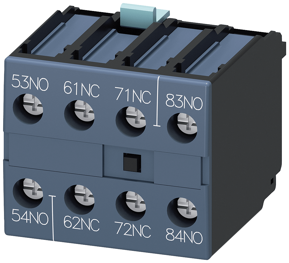 blocchetto di contatti ausiliari sul lato frontale, 2 NO 2 NC, morsetti a vite, per contattore 3RT1, numeri ordinali 5 ... 8 contatto ausiliario SIRIUS 3RH19 per lampliamento dei contatti ausiliari nel circuito di comando. Questo blocchetto di contatti ausiliari 3RH19 può essere montato senza attrezzi sui contattori 3RT1 e sui contattori ausiliari 3RH1 delle grandezze costruttive da S0 a S12. I blocchetti di contatti ausiliari 3RH19/3RH29 sono fornibili come varianti per il montaggio frontale o laterale,con fino a quattro contatti NO con commutazione istantanea o fino a due contatti NO e NC anticipati. I blocchetti di contattiausiliari possono essere in esecuzione con elementi di contatto a guida forzata in contattori ausiliari 3RH o anche come contattispeculari in contattori di potenza 3RT. Essi sono sempre fornibili con morsetti a vite e morsetti a molla. Semplice, efficiente, sempre attuale - il sistema modulare SIRIUS.