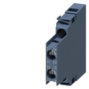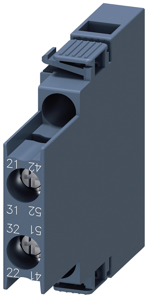 blocchetto di contatti ausiliari, laterale, 2 NC, a sinistra: 41/42, 51/52, a destra: 21/22, 31/32, via di corrente: 1 NC, 1 NC, morsetti a vite, per contattori 3RT2.1 contatto ausiliario SIRIUS 3RH29 per lampliamento dei contatti ausiliari nel circuito di comando. I blocchetti di contatti ausiliari montabili lateralmente 3RH29 possono essere montati senza attrezzi indipendentemente dalla grandezza costruttiva sui contattori 3RT2. I blocchetti di contatti ausiliari 3RH19/3RH29 sono fornibili come varianti per il montaggio frontale o laterale, con fino a quattro contatti NO con commutazione istantanea o fino a due contatti NO e NC anticipati. I blocchetti di contatti ausiliari possono essere in esecuzione con elementi di contatto a guida forzata in contattori ausiliari 3RH o anche come contatti speculari in contattori di potenza 3RT. Essi sono sempre fornibili con morsetti a vite e morsetti a molla. Semplice, efficiente, sempre attuale - il sistema modulare SIRIUS.