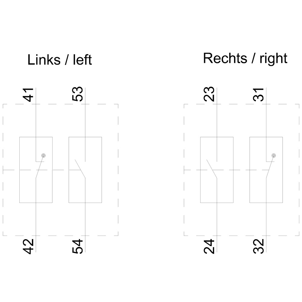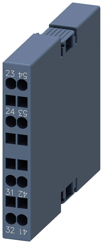 blocchetto di contatti ausiliari, compatibile con lelettronica, laterale, 1 NO + 1 NC, a sinistra: 41/42, 53/54, via di corrente: 1 NC, 1 NO, a destra: 23/24, 31/32, via di corrente: 1 NO, 1 NC, morsetti a molla, per contattori 3RT2.1 contatto ausiliarioSIRIUS 3RH29 per lampliamento dei contatti ausiliari nel circuito di comando. I blocchetti di contatti ausiliari montabili lateralmente 3RH29 possono essere montati senza attrezzi indipendentemente dalla grandezza costruttiva sui contattori 3RT2. I blocchetti di contatti ausiliari 3RH19/3RH29 sono fornibili come varianti per il montaggio frontale o laterale, con fino a quattro contatti NO con commutazione istantanea o fino a due contatti NO e NC anticipati. I blocchetti di contatti ausiliari possono essere in esecuzione con elementi di contatto a guida forzata in contattori ausiliari 3RH o anche come contatti speculari in contattori di potenza 3RT. Essi sono sempre fornibili con morsetti a vite e morsetti a molla. Semplice, efficiente, sempre attuale - il sistema modulare SIRIUS.