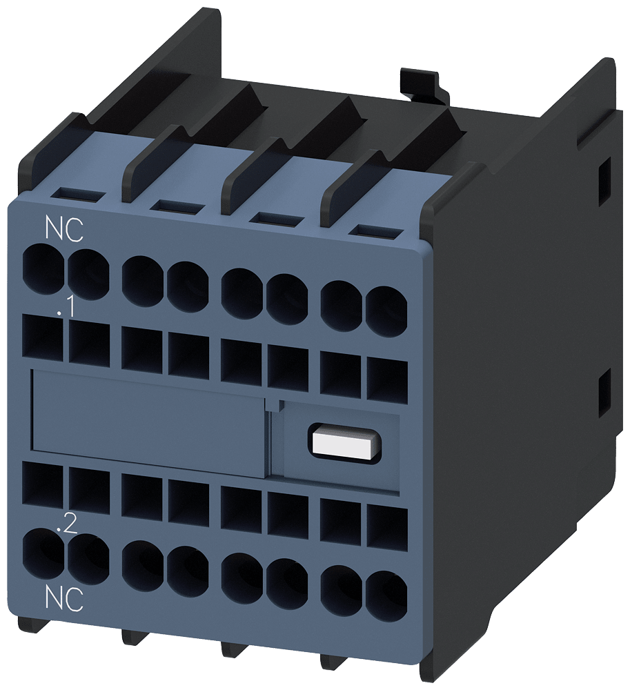 blocchetto di contatti ausiliari, sul lato frontale, 1 NC, .1/.2, --/--, --/--, --/--, via di corrente: 1 NC, --, --, --, morsetti a molla, per contattori 3RT2 e contattori ausiliari 3RH2 contatto ausiliario SIRIUS 3RH29 per lampliamento dei contatti ausiliari nel circuito di comando. I blocchetti di contatti ausiliari frontali 3RH29 possono essere montati senza attrezzi indipendentemente dalla grandezza costruttiva sui contattori 3RT2 e sui contattori ausiliari 3RH2. I blocchetti di contatti ausiliari 3RH19/3RH29 sono fornibili come varianti per il montaggio frontale o laterale, con fino a quattro contatti NO con commutazione istantanea o fino a due contatti NO e NC anticipati. I blocchetti di contatti ausiliari possono essere in esecuzione con elementidi contatto a guida forzata in contattori ausiliari 3RH o anche come contatti speculari in contattori di potenza 3RT. Essi sono sempre fornibili con morsetti a vite e morsetti a molla. Semplice, efficiente, sempre attuale - il sistema modulare SIRIUS.