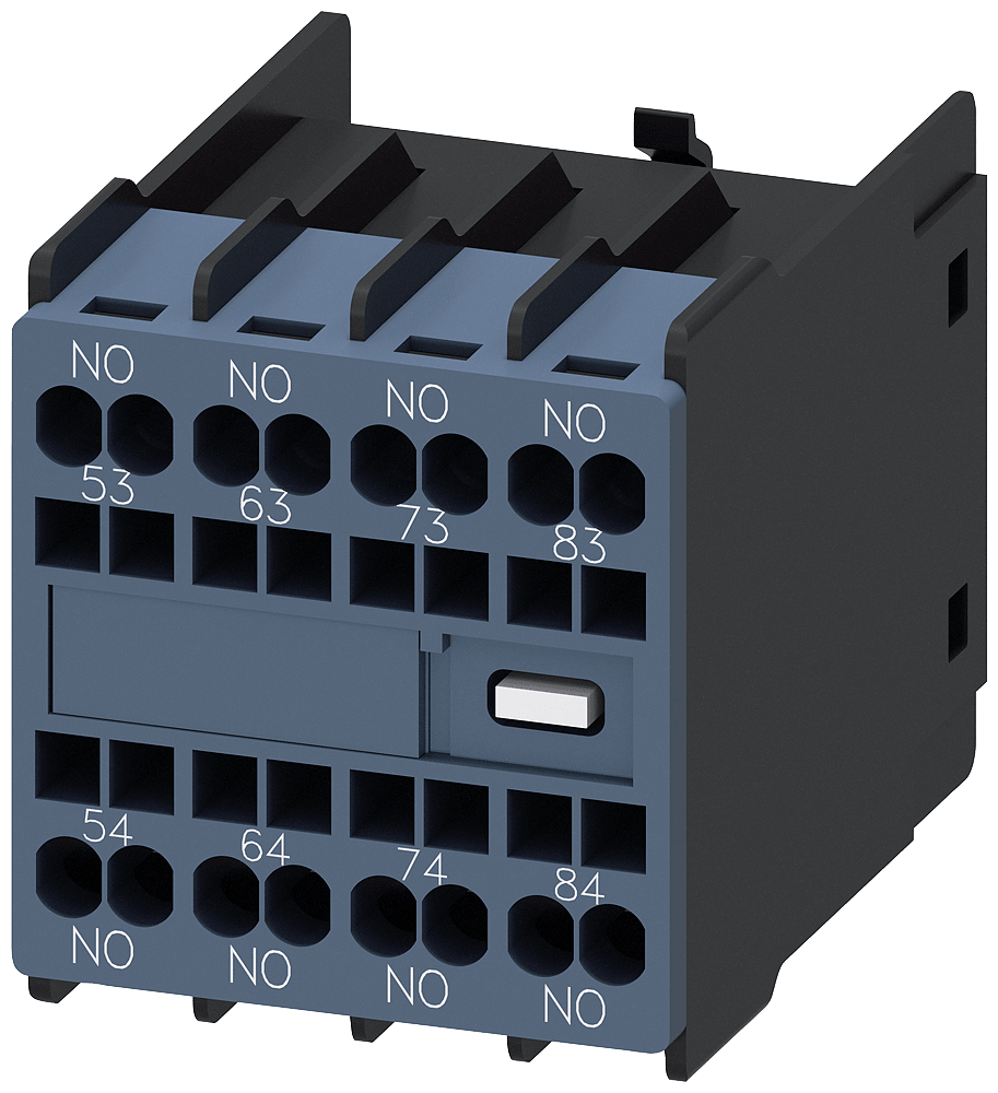 blocchetto di contatti ausiliari, sul lato frontale, 4 NO, 53/54, 63/64, 73/74, 83/84, via di corrente: 1 NO, 1 NO, 1 NO, 1 NO, morsetti a molla, per contattori 3RT2 e contattori ausiliari 3RH2 contatto ausiliario SIRIUS 3RH29 per lampliamento dei contatti ausiliari nel circuito di comando. I blocchetti di contatti ausiliari frontali 3RH29 possono essere montati senza attrezzi indipendentemente dalla grandezza costruttiva sui contattori 3RT2 e sui contattori ausiliari 3RH2. I blocchetti di contatti ausiliari 3RH19/3RH29 sono fornibili come varianti per il montaggio frontale o laterale, con fino a quattro contatti NO con commutazione istantanea o fino a due contatti NO e NC anticipati. I blocchetti di contatti ausiliari possono essere in esecuzione con elementi di contatto a guida forzata in contattori ausiliari 3RH o anche come contatti speculari in contattori di potenza 3RT. Essi sono sempre fornibili con morsetti a vite e morsetti a molla. Semplice, efficiente, sempre attuale - il sistema modulare SIRIUS.