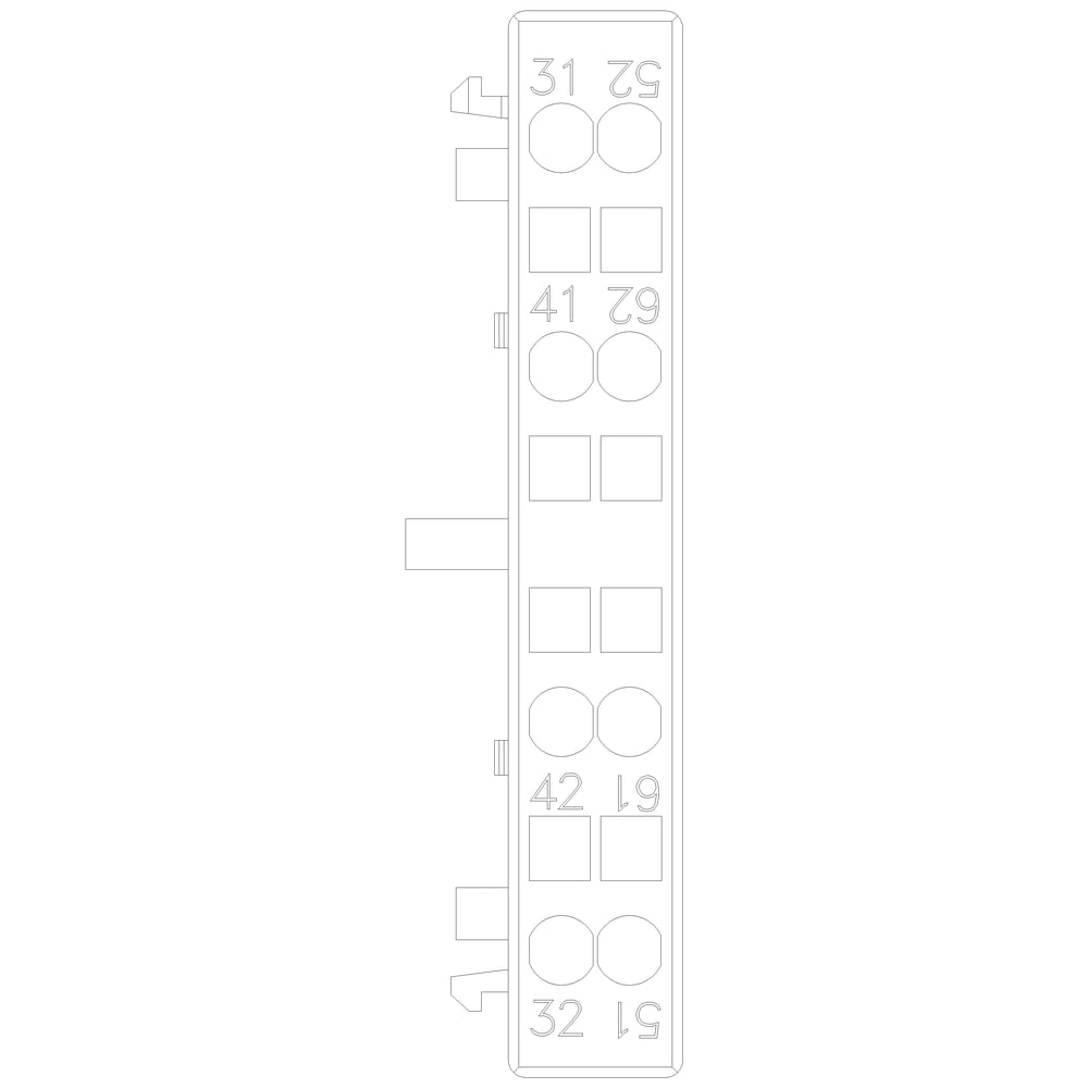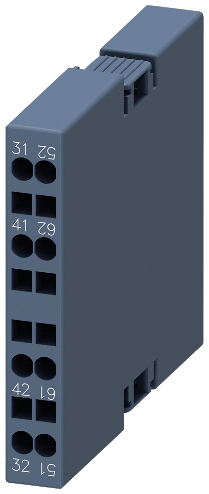blocchetto di contatti ausiliari, laterale, 2 NC, a sinistra: 51/52, 61/62, a destra: 31/32, 41/42, via di corrente: 1 NC, 1 NC, morsetti a molla, per contattori 3RT2 e contattori ausiliari 3RH2 contatto ausiliario SIRIUS 3RH29 per lampliamento dei contatti ausiliari nel circuito di comando. I blocchetti di contatti ausiliari montabili lateralmente 3RH29 possono essere montati senza attrezzi indipendentemente dalla grandezza costruttiva sui contattori 3RT2. I blocchetti di contatti ausiliari 3RH19/3RH29 sono fornibili come varianti per il montaggio frontale o laterale, con fino a quattro contatti NO con commutazione istantanea o fino a due contatti NO e NC anticipati. I blocchetti di contatti ausiliari possono essere in esecuzione con elementi di contatto a guida forzata in contattori ausiliari 3RH o anche come contatti speculari in contattori di potenza 3RT. Essi sono sempre fornibili con morsetti a vite e morsetti a molla. Semplice, efficiente, sempre attuale - il sistema modulare SIRIUS.