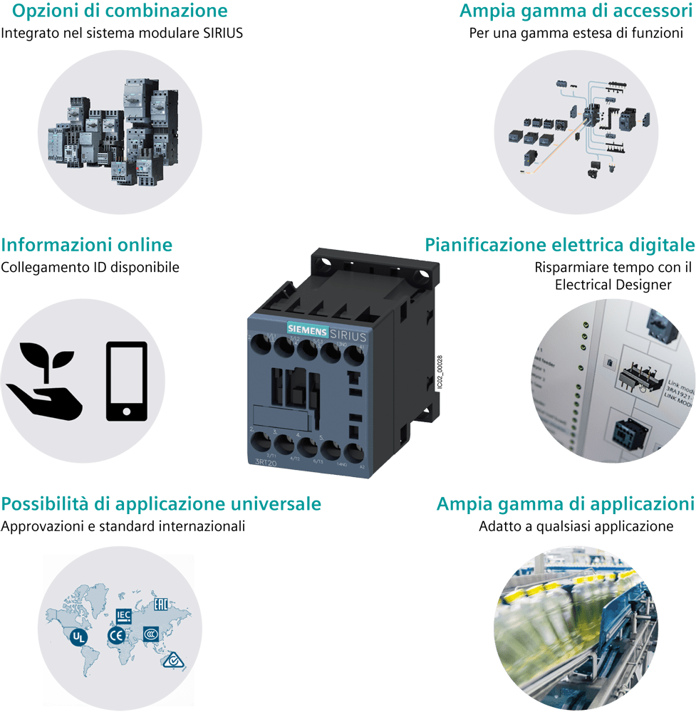 contattore di potenza, AC-3e/AC-3, 9 A, 4 kW / 400 V, a 3 poli, AC 240 V, 50/60 Hz, contatti ausiliari: 1 NC, morsetti a vite, grandezza costruttiva: S00 Contattore di potenza SIRIUS 3RT2 per il comando di motori. I contattori 3RT2 sono parte integrante del sistema componibile SIRIUS con i suoi prodotti perfettamente accordati tra di loro. Essi convincono per la grande potenza in una forma costruttiva compatta e lelevata affidabilità di contatto. Sono combinabili in diversi modi con altri componenti nella partenza. Molte delle combinazioni di apparecchi sono già testate in fabbrica. I contattori offrono per ogni applicazione il collegamento ottimale al controllore (parallelo, tramite AS-i o IO-Link). I blocchetti di contatti ausiliari integrati riducono la complessità del montaggio. Le connessioni frontali semplificano il cablaggio semplice. I contattori 3RT2 sono tropicalizzati, omologati in tutto il mondo (ad es. IEC e UL/CSA) e IE3/IE4ready. Essi sono fornibili in diverse grandezze costruttive e in unampio campo di potenza per il comando in AC e DC. Gli apparecchi sono disponibili oltre che con morsetti a vite anche con morsetti a molla per un collegamento rapido, esente da manutenzione e resistente alle vibrazioni. Tutti gli accessori come ad es. i blocchetti di contatti ausiliari, gli sganciatori ausiliari etc. sono uniformemente adatti per tutte le grandezze costruttive. I moduli di collegamento disponibili, i moduli funzionali e il sistema di alimentazione SIRIUS 3RV29 riducono notevolmente lonere di cablaggio. Semplice, efficiente, sempre attuale - il sistema modulare SIRIUS.