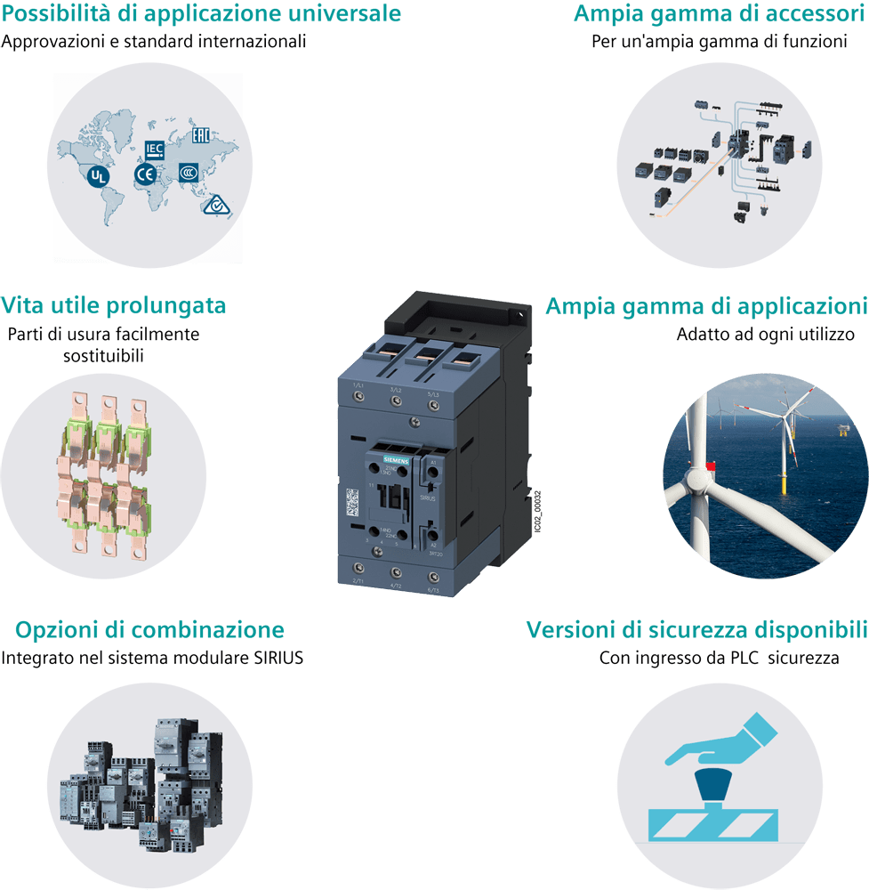 contattore di potenza, AC-3e/AC-3, 80 A, 37 kW / 400 V, a 3 poli, AC 230 V, 50/60 Hz, contatti ausiliari: 2 NO + 2 NC, morsetti a vite, grandezza costruttiva: S3, blocchetto di contatti ausiliari rimovibile Contattore di potenza SIRIUS 3RT2 per il comando di motori. I contattori 3RT2 sono parte integrante del sistema componibile SIRIUS con i suoi prodotti perfettamente accordati tra di loro. Essi convincono per la grande potenza in una forma costruttiva compatta e lelevata affidabilità di contatto. Sono combinabili in diversi modi con altri componenti nella partenza. Molte delle combinazioni di apparecchi sono già testate in fabbrica. I contattori offrono per ogni applicazione il collegamento ottimale al controllore (parallelo, tramite AS-i o IO-Link). Iblocchetti di contatti ausiliari integrati riducono la complessità del montaggio. Le connessioni frontali semplificano il cablaggio semplice. I contattori 3RT2 sono tropicalizzati, omologati in tutto il mondo (ad es. IEC e UL/CSA) e IE3/IE4ready. Essi sono fornibili in diverse grandezze costruttive e in un ampio campo di potenza per il comando in AC e DC. Gli apparecchi sono disponibili oltre che con morsetti a vite anche con morsetti a molla per un collegamento rapido, esente da manutenzione e resistente alle vibrazioni. Tutti gli accessori come ad es. i blocchetti di contatti ausiliari, gli sganciatori ausiliari etc. sono uniformemente adatti per tutte le grandezze costruttive. I moduli di collegamento disponibili, i moduli funzionali e il sistema di alimentazione SIRIUS 3RV29 riducono notevolmente lonere di cablaggio. Semplice, efficiente, sempre attuale - il sistema modulare SIRIUS.