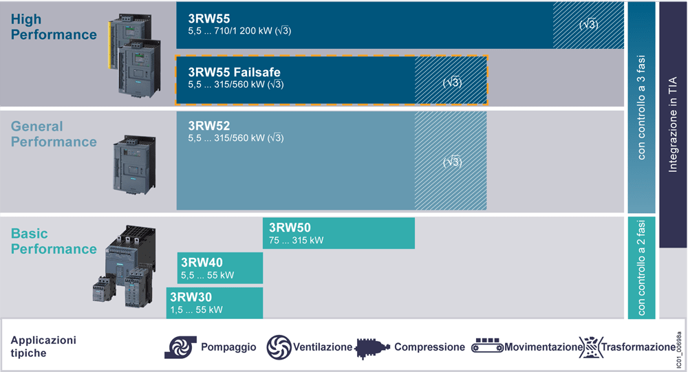 softstarter SIRIUS S2 45 A, 22 kW/400 V, 40 °C AC 200-480 V, AC/DC 24 V morsetti a vite Softstarter SIRIUS 3RW30 per applicazioni standard con avviamento graduale di motori asincroni trifase. Avviamento graduale, riduzione dei picchi di corrente, esclusione di oscillazioni della tensione di rete durante lavviamento, sgravio del carico della rete di alimentazione, del carico meccanico nellazionamento, notevole risparmio di spazio e cablaggio rispetto agli avviatori stella-triangolo e ai convertitori di frequenza, assenza di manutenzione e grande facilità duso. Il bypass integrato consente di realizzare una forma costruttiva assai compatta e assicura un basso riscaldamento nel quadro elettrico. Omologazioni internazionali (ad es. IEC e UL/CSA). I softstarter 3RW sono disponibili per reti fino a 690 V in un ampio campo di potenza con diverse tensioni di alimentazione di comando e con morsetti a vite e molla. Per 3RW30/40 ci sono ulteriori varianti con tensione di alimentazione di comando di 24 V. Alcuni dei3RW40 fino alla grandezza costruttiva S3 nonché tutti i 3RW44 offrono inoltre una protezione motore a termistori. Con il modulo di collegamento opzionale si possono montare i softstarter sugli interruttori automatici, persino per le varianti con contattia molla. Semplice, efficiente, sempre attuale - il sistema modulare SIRIUS.