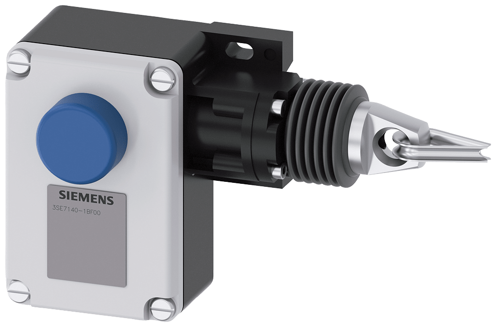 interruttore a fune custodia in metallo, 1x M20x1,5; 2 NC, con blocco di ritenzione EN ISO 13850 e sblocco a pulsante, per lunghezze di fune fino a 50 m interruttore a fune SIRIUS 3SE7 per la sorveglianza o come dispositivo di ARRESTO DI EMERGENZA per parti dimpianto particolarmente pericolose, ad es. per nastri trasportatori. Con gli interruttori a fune è possibile realizzare funzioni di comando e di ARRESTO DI EMERGENZA per ogni esigenza. Gli apparecchi sono semplici da bloccare e dispongono di un pulsante di ARRESTO DI EMERGENZA integrato e di una visualizzazione a LED visibile anche a grande distanza. Gli interruttori soddisfano i massimi requisiti disicurezza secondo PL e o SIL 3. Essi sono disponibili con lunghezze di fune diverse, combinazioni di elementi di contatto, con indicatori a LED o pulsante a fungo di ARRESTO DI EMERGENZA. Le varianti con blocco sono fornite con sblocco a pressione, a chiave o a rotazione. Come accessori sono disponibili funi di acciaio con guaina in plastica rossa in diverse lunghezze con rispettivi accessori di fissaggio. Safety is a SIRIUS business.