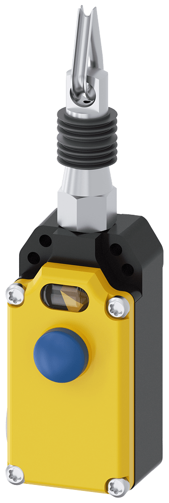 interruttore a fune SIRIUS custodia in metallo con coperchio giallo 2 x M20 x1,5; 1NO+2NC, con dispositivo di arresto secondo EN ISO 13850 sblocco a pulsante, per lunghezza della fune 20m interruttore a fune SIRIUS 3SE7 per la sorveglianza o come dispositivo di ARRESTO DI EMERGENZA per parti dimpianto particolarmente pericolose, ad es. per nastri trasportatori. Con gli interruttori a fune è possibile realizzare funzioni di comando e di ARRESTO DI EMERGENZA per ogni esigenza. Gli apparecchi sono semplici da bloccare e dispongono di un pulsante di ARRESTO DI EMERGENZA integrato e di una visualizzazione a LED visibile anche a grande distanza. Gli interruttori soddisfano i massimi requisiti disicurezza secondo PL e o SIL 3. Essi sono disponibili con lunghezze di fune diverse, combinazioni di elementi di contatto, con indicatori a LED o pulsante a fungo di ARRESTO DI EMERGENZA. Le varianti con blocco sono fornite con sblocco a pressione, a chiave o a rotazione. Come accessori sono disponibili funi di acciaio con guaina in plastica rossa in diverse lunghezze con rispettivi accessori di fissaggio. Safety is a SIRIUS business.
