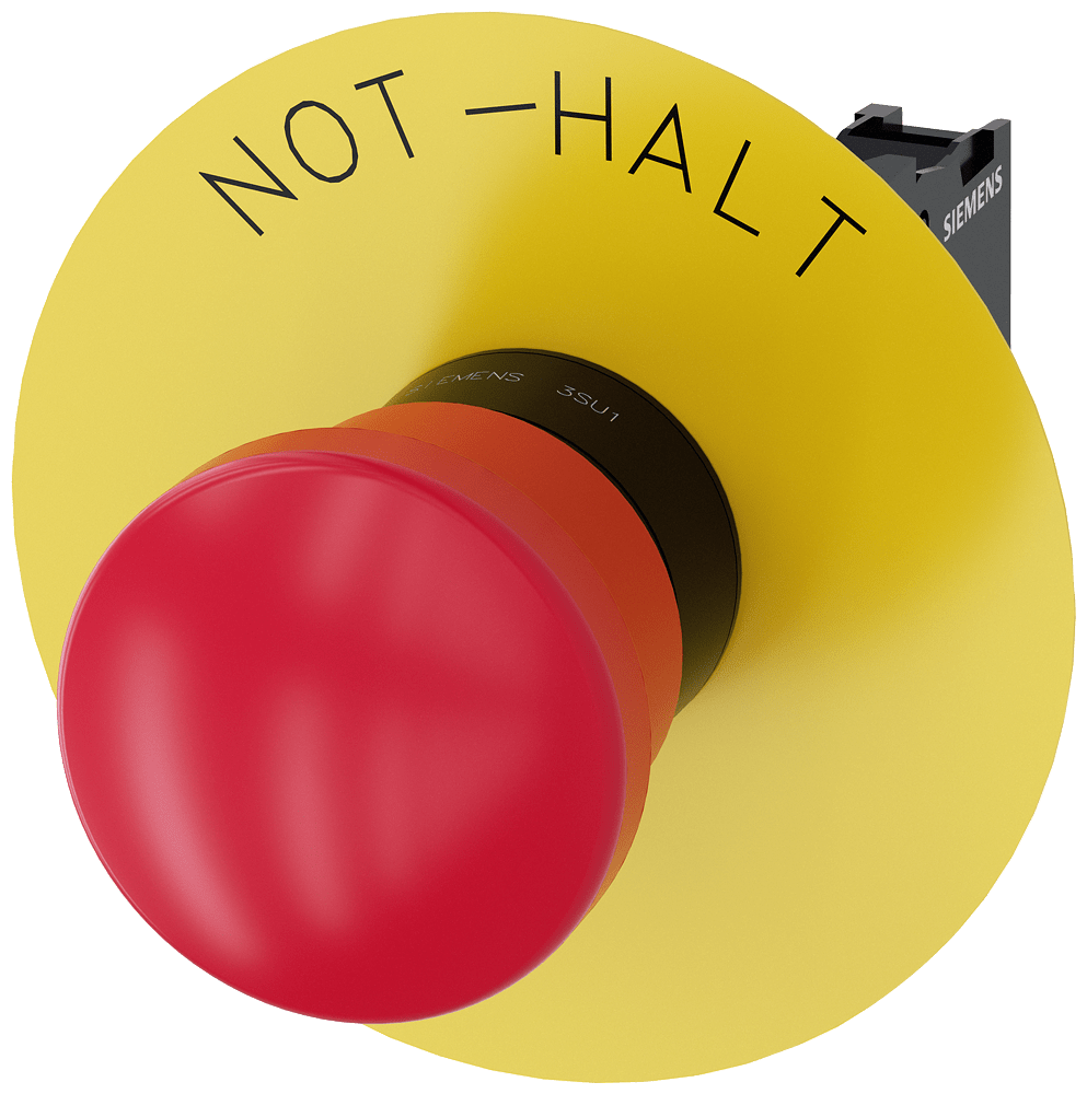 pulsante a fungo di ARRESTO DI EMERGENZA, 22 mm, rotondo, plastica, rosso, 40 mm, permanente con blocco positivo, secondo EN ISO 13850, sblocco a trazione, con disco targhetta giallo, iscrizione: NOT-HALT, con supporto, 1 NC, morsetti a vite Pulsante a fungo di ARRESTO DI EMERGENZA SIRIUS ACT secondo EN ISO 13850 per il comando di applicazioni relative alla sicurezza a prova di manomissione. Siemens offre, sotto il nome commerciale SIRIUS ACT, un portfolio esclusivo di dispositivi di comando e segnalazione con omologazioni di prodotto per il mercato mondiale in tre moderne serie di design in robusto metallo puro e plastica pregiata.Linnovativo concetto di innesto a scatto semplifica talmente il montaggio che per eseguirlo basta una sola mano e non servono attrezzi speciali. Per i fori di montaggio sono sufficienti semplici fori non scanalati, essendo già integrata una protezione antirotazione al 100 %.Grazie al grado di protezione elevato i robusti apparecchi sono adatti allimpiego industriale e in ambiente esterno. È persino possibile la pulizia con getto ad alta pressione. Né polvere, né oli, né liscivia possono comprometterne il funzionamento affidabile.Oltre che con il cablaggio standard, gli apparecchi possono essere collegati al controllore anche tramite PROFINET, AS-Interface oppure IO-Link. Potete così ridurre il vostro onere di cablaggio, minimizzare le fonti di errore e ottenere maggiore flessibilità.Il configuratore online grafico supporta in modo confortevole la scelta e lordinazione di singoli apparecchi, pulsantiere e iscrizioni. È disponibile una documentazione completa (ad es. manuale, dati 3D, schema di collegamento). Esecuzioni fornibili: diametro del fungo di 30/40/60 mm, luminoso/non luminoso, sblocco a trazione/a rotazione/a chiave. Avvertenza: Apparecchio completo, fornitura incl. supporto e moduli. SIRIUS ACT - Performance in Action nel comando e nella segnalazione. Semplici da montare, altamente performanti, semplicemente perfetti.