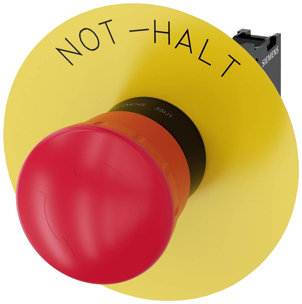 pulsante a fungo di ARRESTO DI EMERGENZA, 22 mm, rotondo, plastica, rosso, 40 mm, permanente con blocco positivo, secondo EN ISO 13850, sblocco a rotazione, con disco targhetta giallo, iscrizione: NOT-HALT, con supporto, 1 NC, morsetti a vite Pulsante a fungo di ARRESTO DI EMERGENZA SIRIUS ACT secondo EN ISO 13850 per il comando di applicazioni relative alla sicurezza a prova di manomissione. Siemens offre, sotto il nome commerciale SIRIUS ACT, un portfolio esclusivo di dispositivi di comando e segnalazione con omologazioni di prodotto per il mercato mondiale in tre moderne serie di design in robusto metallo puro e plastica pregiata.Linnovativo concetto di innesto a scatto semplifica talmente il montaggio che per eseguirlo basta una sola mano e non servono attrezzi speciali. Per i fori di montaggio sono sufficienti semplici fori non scanalati, essendo già integrata una protezione antirotazione al 100 %.Grazie al grado di protezione elevato i robusti apparecchi sono adatti allimpiego industriale e in ambiente esterno. È persino possibile la pulizia con getto ad alta pressione. Né polvere, né oli, né liscivia possono comprometterne il funzionamento affidabile.Oltre che con il cablaggio standard, gli apparecchi possono essere collegati al controllore anche tramite PROFINET, AS-Interface oppure IO-Link. Potete così ridurre il vostro onere di cablaggio, minimizzare le fonti di errore e ottenere maggiore flessibilità.Il configuratore online grafico supporta in modo confortevole la scelta e lordinazione di singoli apparecchi, pulsantiere e iscrizioni. È disponibile una documentazione completa (ad es. manuale, dati 3D, schema di collegamento). Esecuzioni fornibili: diametro del fungo di 30/40/60 mm, luminoso/non luminoso, sblocco a trazione/a rotazione/a chiave.Avvertenza: Apparecchio completo, fornitura incl. supporto e moduli. SIRIUS ACT - Performance in Action nel comando e nella segnalazione. Semplici da montare, altamente performanti, semplicemente perfetti.