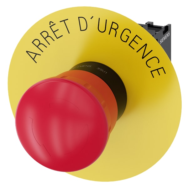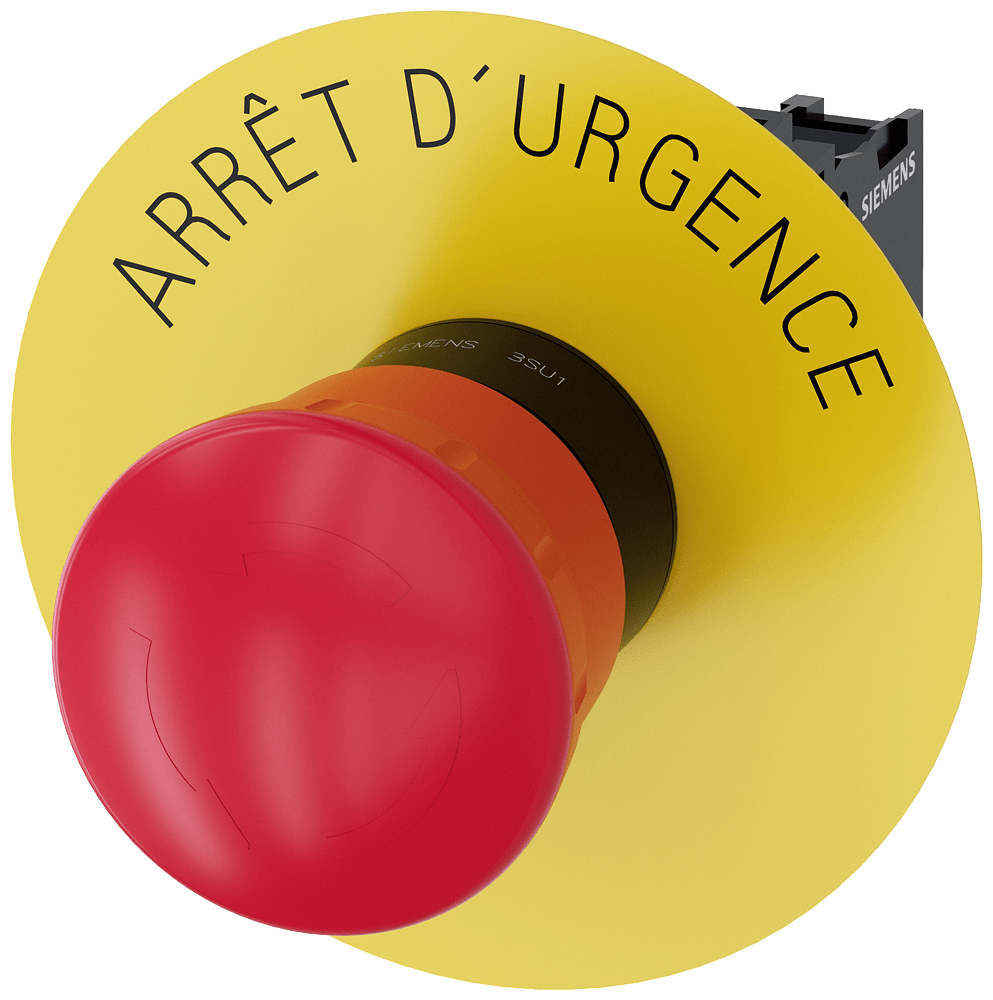pulsante a fungo di ARRESTO DI EMERGENZA, 22 mm, rotondo, in plastica, rosso, 40 mm, permanente con blocco positivo, a norma DIN EN ISO 13850, sblocco a rotazione, con disco targhetta giallo, iscrizione: Arrêt durgence con supporto, 1 NC, morsetto a vitePulsante a fungo di ARRESTO DI EMERGENZA SIRIUS ACT secondo EN ISO 13850 per il comando di applicazioni relative alla sicurezza a prova di manomissione. Siemens offre, sotto il nome commerciale SIRIUS ACT, un portfolio esclusivo di dispositivi di comandoe segnalazione con omologazioni di prodotto per il mercato mondiale in tre moderne serie di design in robusto metallo puro e plastica pregiata.Linnovativo concetto di innesto a scatto semplifica talmente il montaggio che per eseguirlo basta una sola manoe non servono attrezzi speciali. Per i fori di montaggio sono sufficienti semplici fori non scanalati, essendo già integrata una protezione antirotazione al 100 %.Grazie al grado di protezione elevato i robusti apparecchi sono adatti allimpiego industriale e in ambiente esterno. È persino possibile la pulizia con getto ad alta pressione. Né polvere, né oli, né liscivia possono comprometterne il funzionamento affidabile.Oltre che con il cablaggio standard, gli apparecchi possono essere collegati al controllore anche tramite PROFINET, AS-Interface oppure IO-Link. Potete così ridurre il vostro onere di cablaggio, minimizzare le fonti di errore e ottenere maggiore flessibilità.Il configuratore online grafico supporta in modo confortevole la scelta e lordinazione di singoli apparecchi, pulsantiere e iscrizioni. È disponibile una documentazione completa (ad es. manuale, dati 3D, schema di collegamento). Esecuzioni fornibili: diametro del fungo di 30/40/60 mm, luminoso/non luminoso, sblocco a trazione/a rotazione/a chiave. Avvertenza: Apparecchio completo, fornitura incl. supporto e moduli. SIRIUS ACT - Performance in Action nel comando e nella segnalazione. Semplici da montare, altamente performanti, semplicemente perfetti.