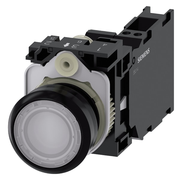 pulsante luminoso, 22 mm, rotondo, in plastica, bianco, bottone, piatto, ad impulso, con supporto, 1 NO+1 NC, modulo LED con LED integrato AC/DC 24V, morsetto a molla Pulsanti luminosi SIRIUS ACT per la commutazione e il comando di utilizzatori elettrici. Siemens offre, sotto il nome commerciale SIRIUS ACT, un portfolio esclusivo di dispositivi di comando e segnalazione con omologazioni di prodotto per il mercato mondiale in tre moderne serie di design in robusto metallo puro e plastica pregiata.Linnovativo concetto di innesto a scatto semplifica talmente il montaggio che per eseguirlo basta una sola mano e non servono attrezzi speciali. Per i fori di montaggio sono sufficienti semplici fori non scanalati, essendo già integrata una protezione antirotazione al 100 %.Grazie al grado di protezione elevato i robusti apparecchi sono adatti allimpiego industriale e in ambiente esterno. È persino possibile la pulizia con getto ad alta pressione. Né polvere, né oli, né liscivia possono comprometterne il funzionamento affidabile.Oltre che con il cablaggio standard, gli apparecchi possono essere collegati al controllore anche tramite PROFINET, AS-Interface oppure IO-Link. Potete così ridurre il vostro onere di cablaggio, minimizzare le fonti di errore e ottenere maggiore flessibilità.Il configuratore online grafico supporta in modo confortevole la scelta e lordinazione di singoli apparecchi, pulsantiere e iscrizioni. È disponibile una documentazione completa (ad es. manuale, dati 3D, schema di collegamento). Esecuzioni fornibili: più colori, luminoso/non luminoso, con/senza iscrizione, comando permanente/ad impulso, diverse altezze di bottone e ghiera. Avvertenza: Apparecchio completo, fornitura incl. supporto e moduli. SIRIUS ACT - Performance in Action nel comando e nella segnalazione. Semplici da montare, altamente performanti, semplicemente perfetti.