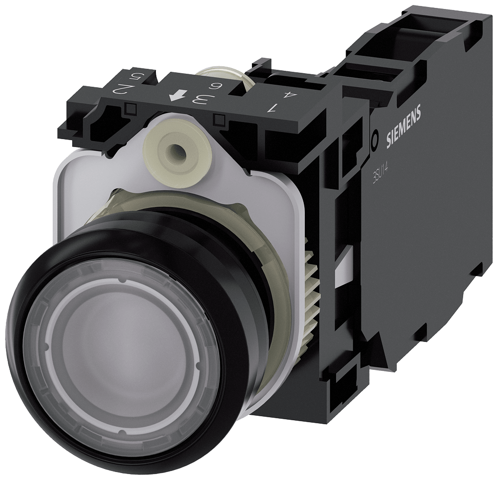 pulsante luminoso, 22 mm, rotondo, in plastica, trasparente, bottone, piatto, ad impulso, con supporto, 1 NO+1 NC, modulo LED con LED integrato AC/DC 24V, morsetto a vite Pulsanti luminosi SIRIUS ACT per la commutazione e il comando di utilizzatori elettrici. Siemens offre, sotto il nome commerciale SIRIUS ACT, un portfolio esclusivo di dispositivi di comando e segnalazione con omologazioni di prodotto per il mercato mondiale in tre moderne serie di design in robusto metallo puro e plastica pregiata.Linnovativo concetto di innesto a scatto semplifica talmente il montaggio che per eseguirlo basta una sola mano e non servono attrezzi speciali. Per i fori di montaggio sono sufficienti semplici fori non scanalati, essendo già integrata una protezione antirotazione al 100 %.Grazie al grado di protezione elevato i robusti apparecchi sono adatti allimpiego industriale e in ambiente esterno. È persino possibile la pulizia con getto ad alta pressione. Né polvere, né oli, né liscivia possono comprometterne il funzionamento affidabile.Oltre che con il cablaggio standard, gli apparecchi possono essere collegati al controllore anche tramite PROFINET, AS-Interface oppure IO-Link. Potete così ridurre il vostro onere di cablaggio, minimizzare le fonti di errore e ottenere maggiore flessibilità.Il configuratore online grafico supporta in modo confortevole la scelta e lordinazione di singoli apparecchi, pulsantiere e iscrizioni. È disponibile una documentazione completa (ad es. manuale, dati 3D, schema di collegamento). Esecuzioni fornibili: più colori, luminoso/non luminoso, con/senza iscrizione, comando permanente/ad impulso, diverse altezze di bottone e ghiera. Avvertenza: Apparecchio completo, fornitura incl. supporto e moduli. SIRIUS ACT - Performance in Action nel comando e nella segnalazione. Semplici da montare, altamente performanti, semplicemente perfetti.