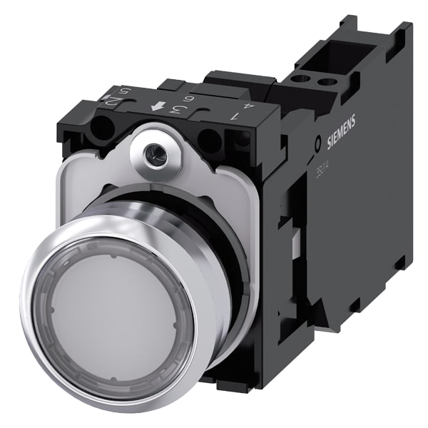 pulsante luminoso, 22 mm, rotondo, in metallo, lucido, trasparente, bottone, piatto, ad impulso, con supporto, 1 NO+1 NC, modulo LED con LED integrato AC 110 V, morsetto a molla Pulsanti luminosi SIRIUS ACT per la commutazione e il comando di utilizzatori elettrici. Siemens offre, sotto il nome commerciale SIRIUS ACT, un portfolio esclusivo di dispositivi di comando e segnalazione con omologazioni di prodotto per il mercato mondiale in tre moderne serie di design in robusto metallo puro e plastica pregiata.Linnovativo concetto di innesto a scatto semplifica talmente il montaggio che per eseguirlo basta una sola mano e non servono attrezzi speciali. Per i fori di montaggio sono sufficienti semplici fori non scanalati, essendo già integrata una protezione antirotazione al 100 %.Grazie al grado di protezione elevato i robusti apparecchi sono adatti allimpiego industriale e in ambiente esterno. È persino possibile la pulizia con getto ad alta pressione. Né polvere, né oli, né liscivia possono comprometterne il funzionamento affidabile.Oltre che con il cablaggio standard, gli apparecchi possono essere collegati al controllore anche tramite PROFINET, AS-Interface oppure IO-Link. Potete così ridurre il vostro onere di cablaggio, minimizzare le fonti di errore eottenere maggiore flessibilità.Il configuratore online grafico supporta in modo confortevole la scelta e lordinazione di singoli apparecchi, pulsantiere e iscrizioni. È disponibile una documentazione completa (ad es. manuale, dati 3D, schema di collegamento). Esecuzioni fornibili: più colori, luminoso/non luminoso, con/senza iscrizione, comando permanente/ad impulso, diverse altezze di bottone e ghiera. Avvertenza: Apparecchio completo, fornitura incl. supporto e moduli. SIRIUS ACT - Performance in Action nel comando e nella segnalazione. Semplici da montare, altamente performanti, semplicemente perfetti.