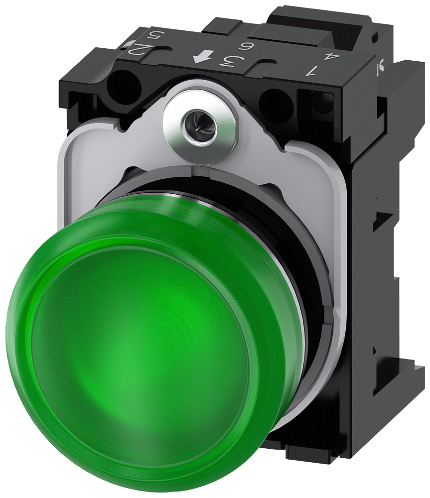 indicatore luminoso, 22 mm, rotondo, in metallo, lucido, verde, lente, liscio, con supporto, modulo LED con LED integrato AC 110 V, morsetto a molla Indicatore luminoso SIRIUS ACT per la segnalazione di stati di commutazione o guasti in impianti, con forte intensità luminosa grazie alla tecnologia LED ad efficienza energetica. Siemens offre, sotto il nome commerciale SIRIUS ACT, un portfolio esclusivo di dispositivi di comando e segnalazione con omologazioni di prodotto per il mercato mondiale in tre moderne serie di design in robusto metallo puro e plastica pregiata.Linnovativo concetto di innesto a scatto semplifica talmente il montaggio che per eseguirlo basta una sola mano e non servono attrezzi speciali. Per i fori di montaggio sono sufficienti semplici fori non scanalati, essendo già integrata una protezione antirotazione al 100 %.Grazie al grado di protezione elevato i robusti apparecchi sono adatti allimpiego industriale e in ambiente esterno. È persino possibile la pulizia con getto ad alta pressione. Né polvere, né oli, né liscivia possono comprometterne il funzionamento affidabile.Oltre che con il cablaggio standard, gli apparecchi possono essere collegati al controllore anche tramite PROFINET, AS-Interface oppure IO-Link. Potete così ridurre il vostro onere di cablaggio, minimizzare le fonti di errore e ottenere maggiore flessibilità.Il configuratore online grafico supporta in modo confortevole la scelta e lordinazione di singoli apparecchi, pulsantiere e iscrizioni. È disponibile una documentazione completa (ad es. manuale, dati 3D, schema di collegamento). Esecuzioni fornibili: più colori, diverse varianti di tensione. Avvertenza: Apparecchio completo, fornitura incl. supporto e moduli. SIRIUS ACT - Performance in Action nel comando e nellasegnalazione. Semplici da montare, altamente performanti, semplicemente perfetti.