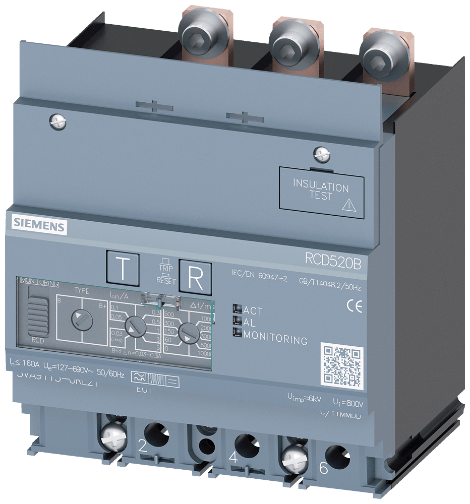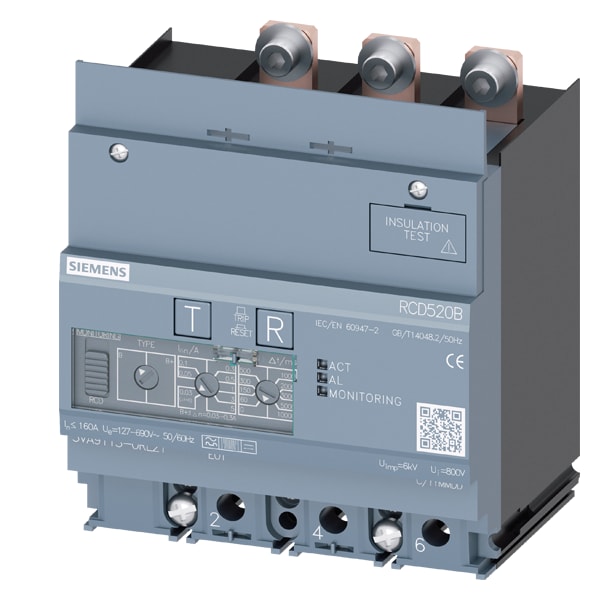 dispositivo a corrente differenziale RCD520B Basic RCD tipo B o B+ montato in basso corrente di guasto nominale 0,03...5A tempo regolabile 0...10000ms a 3 poli In=160A Ue=127...690V accessori per: 3VA11 Interruttori automatici scatolati SENTRON 3VA - un sistema. Per tutte le applicazioni.