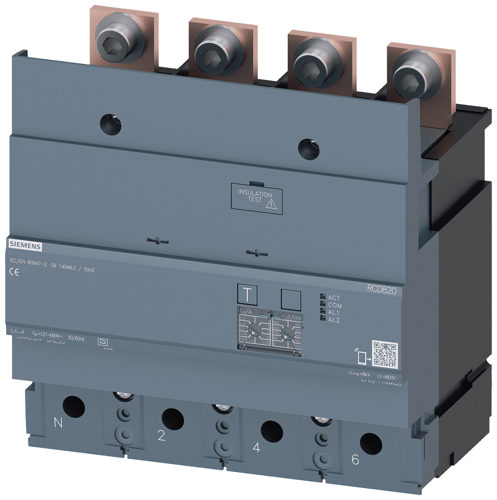 dispositivo di protezione differenziale RCD820 Advanced RCD Tipo A montato in basso corrente di guasto nominale 0,03 ... 30 A a 50/60 Hz tempo regolabile 0 ... 10000 ms a 4 poli In=400A Ue=100-690V Accessori per: 3VA2 Interruttori automatici scatolati SENTRON 3VA - un sistema. Per tutte le applicazioni.
