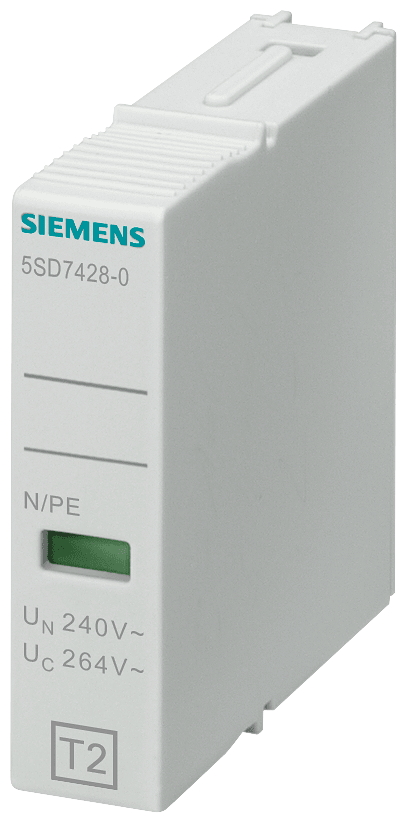 cartuccia estraibile tipo 2 N-PE classe di requisiti C, Uc 260V a 1 polo, forma costruttiva stretta per scaricatore di sovratensioni 5SD742...e scaricatore combinato 5SD744. Apparecchi di protezione da sovratensione in impianti elettrici. Gli apparecchi di protezione da sovratensioni Siemens si contraddistinguono soprattutto per le seguenti caratteristiche: 1. Protezione efficace dellinvestimento e dellimpianto da fulmini e sovratensioni. 2. La protezione da fulmini e sovratensioni adatta per ogni caso applicativo (tipo da 1 a 3). 3. Contatto di segnalazione a distanza per lupload esterno della visualizzazione di stato. 4. Sicurezza affidabile durante linstallazione grazie alla protezione avvolgente e alla protezione contro i contatti accidentali come standard di serie. 5. Rimozione senza attrezzi dalla guida DIN. 6. Visualizzazione errore chiaramente visibile. 7. Il codice DataMatrix sul frontale dellapparecchio fornisce tutte le informazioni sulla protezione da fulmini e sovratensioni in modo rapido e semplice. 8. Tecnica ottimale per la vostra sicurezza - solo da Siemens.