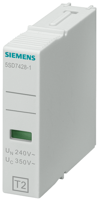 cartuccia estraibile tipo 2 L-N classe di requisiti C, Uc 350V a 1 polo, forma costruttiva stretta per scaricatore di sovratensioni 5SD742...e scaricatore combinato 5SD744. Apparecchi di protezione da sovratensione in impianti elettrici. Gli apparecchi di protezione da sovratensioni Siemens si contraddistinguono soprattutto per le seguenti caratteristiche: 1. Protezione efficace dellinvestimento e dellimpianto da fulmini e sovratensioni. 2. La protezione da fulmini e sovratensioni adatta per ogni caso applicativo (tipo da 1 a 3). 3. Contatto di segnalazione a distanza per lupload esterno della visualizzazione di stato. 4. Sicurezza affidabile durante linstallazione grazie alla protezione avvolgente e alla protezione contro i contatti accidentali come standard di serie. 5. Rimozione senza attrezzi dalla guida DIN. 6. Visualizzazione errore chiaramente visibile. 7. Il codice DataMatrix sul frontale dellapparecchio fornisce tutte le informazioni sulla protezione da fulmini e sovratensioni in modo rapido e semplice. 8. Tecnica ottimale per la vostra sicurezza - solo da Siemens.
