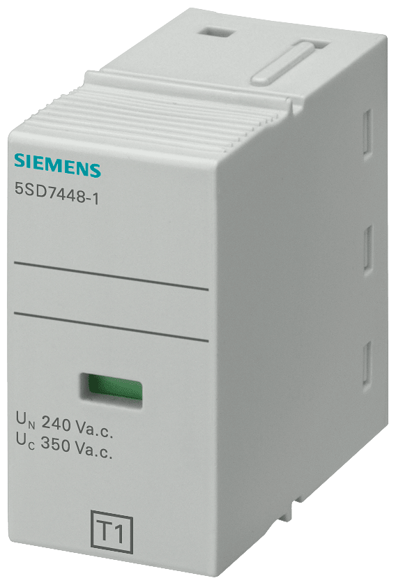 cartuccia estraibile tipo 1 L-N classe di requisiti B, Uc 350V a 1 polo per scaricatore combinato 5SD744 Apparecchi di protezione da sovratensione in impianti elettrici. Gli apparecchi di protezione da sovratensioni Siemens si contraddistinguono soprattutto per le seguenti caratteristiche: 1. Protezione efficace dellinvestimento e dellimpianto da fulmini e sovratensioni. 2. La protezione da fulmini e sovratensioni adatta per ogni caso applicativo (tipo da 1 a 3). 3. Contatto di segnalazione a distanza per lupload esterno della visualizzazione di stato. 4. Sicurezza affidabile durante linstallazione grazie alla protezione avvolgente e alla protezione contro i contatti accidentali come standard di serie. 5. Rimozione senza attrezzi dalla guida DIN. 6. Visualizzazione errore chiaramente visibile. 7. Il codice DataMatrix sul frontale dellapparecchio fornisce tutte le informazioni sulla protezione da fulmini e sovratensioni in modo rapido e semplice. 8. Tecnica ottimale per la vostra sicurezza - solo da Siemens.
