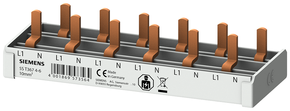 sbarra di collegamento a punte compatta 10 mm2 collegamento 1p/N 6x apparecchio compatto 1 UM protezione contro i contatti accidentali 6 UM lunghezza fissa sbarra di collegamento a punte SENTRON 5ST3 come componente aggiuntivo per dispositivi differenziali e interruttori magnetotermici. Questi componenti aggiuntivi sono universalmente montabili. Sono facili e comodi da montare e collegare. Grazie alla protezione contro i contatti accidentali di serie, la sicurezza è garantita in modo affidabile durante linstallazione. Tecnica ottimale per la vostra sicurezza - solo da Siemens.