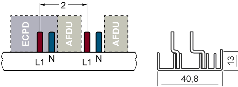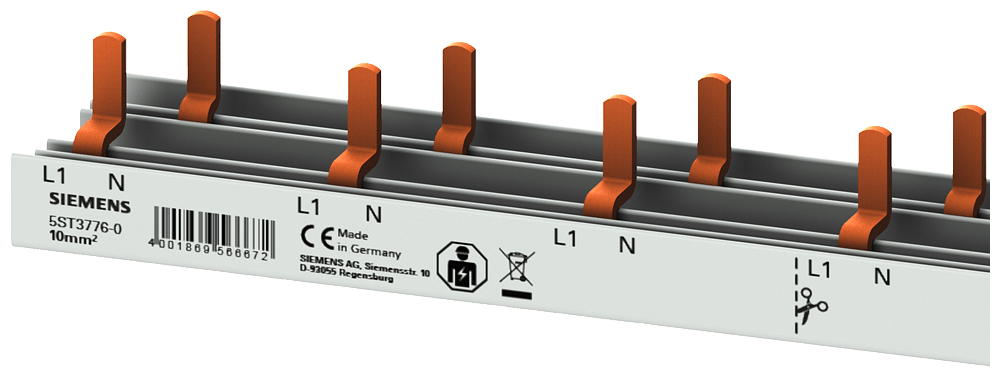 sbarra di collegamento a punte compatta 10 mm2 collegamento 1p/N AFDD 5SM6 + apparecchio compatto 1 UM protezione contro i contatti accidentali tranciabile a 1m sbarra di collegamento a punte SENTRON 5ST3 come componente aggiuntivo per dispositivi differenziali e interruttori magnetotermici. Questi componenti aggiuntivi sono universalmente montabili. Sono facili e comodi da montare e collegare. Grazie alla protezione contro i contatti accidentali di serie, la sicurezza è garantita in modo affidabile durante linstallazione. Tecnica ottimale per la vostra sicurezza - solo da Siemens.