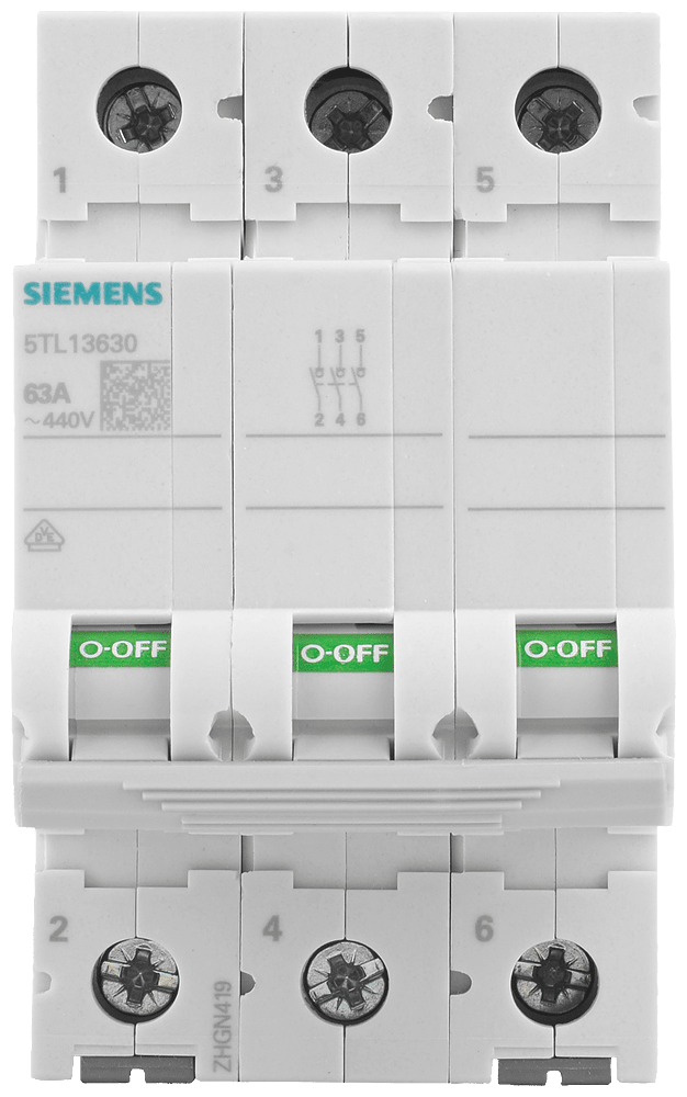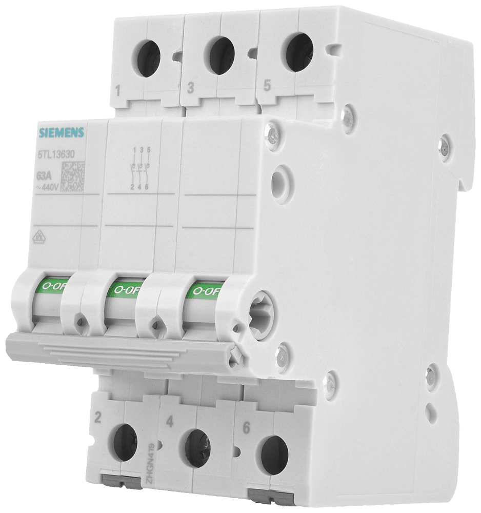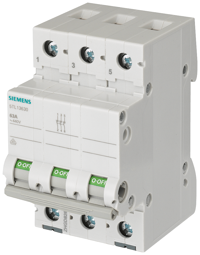 sezionatore sottocarico, interruttore ON/OFF 63 A a 3 poli Interruttore ON/OFF SENTRON 5TL1 per il comando di luci, motori ed altre apparecchiature elettriche. Elevata sicurezza di funzionamento e disponibilità degli impianti grazie allinserzione e alla disinserzione separata del circuito interessato con indicazione di posizione dellinterruttore chiaramente visibile. Sicurezza affidabile durante linstallazione grazie alla protezione avvolgente e alla protezione contro i contatti accidentali come standarddi serie. Rimozione senza attrezzi dalla guida DIN o dalla struttura di sbarre collettrici grazie al comodo cursore di sgancio manuale. Impiegabile come sezionatore sottocarico secondo EN 60947-1 per il sezionamento o la messa fuori tensione di impianti.Grazie al suo design uniforme, linterruttore ON-OFF 5TL1 si integra perfettamente nella serie di interruttori differenziali e interruttori magnetotermici. Tecnica ottimale per la vostra sicurezza - solo da Siemens.