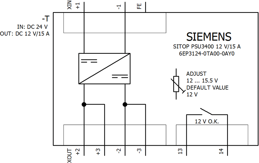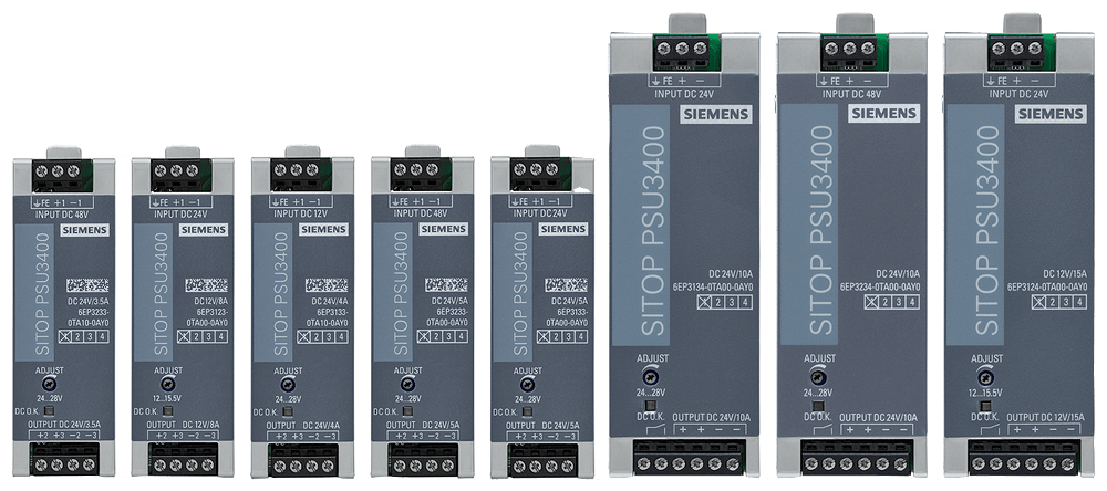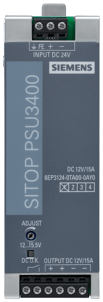 SITOP PSU3400 12 V/15 A alimentatore stabilizzato ingresso: DC 24 V (14 … 32 V) uscita: DC 12 V/15 A Convertitore di tensione continua SITOP PSU3400 per unalimentazione di tensione stabile a 12 V o 24 V anche in caso di oscillazioni della tensione di ingresso. Il convertitore DC/DC SITOP PSU3400, grazie al suo ampio campo della tensione di ingresso, è perfettamente adatto per il funzionamento con tutte le batterie di uso corrente.