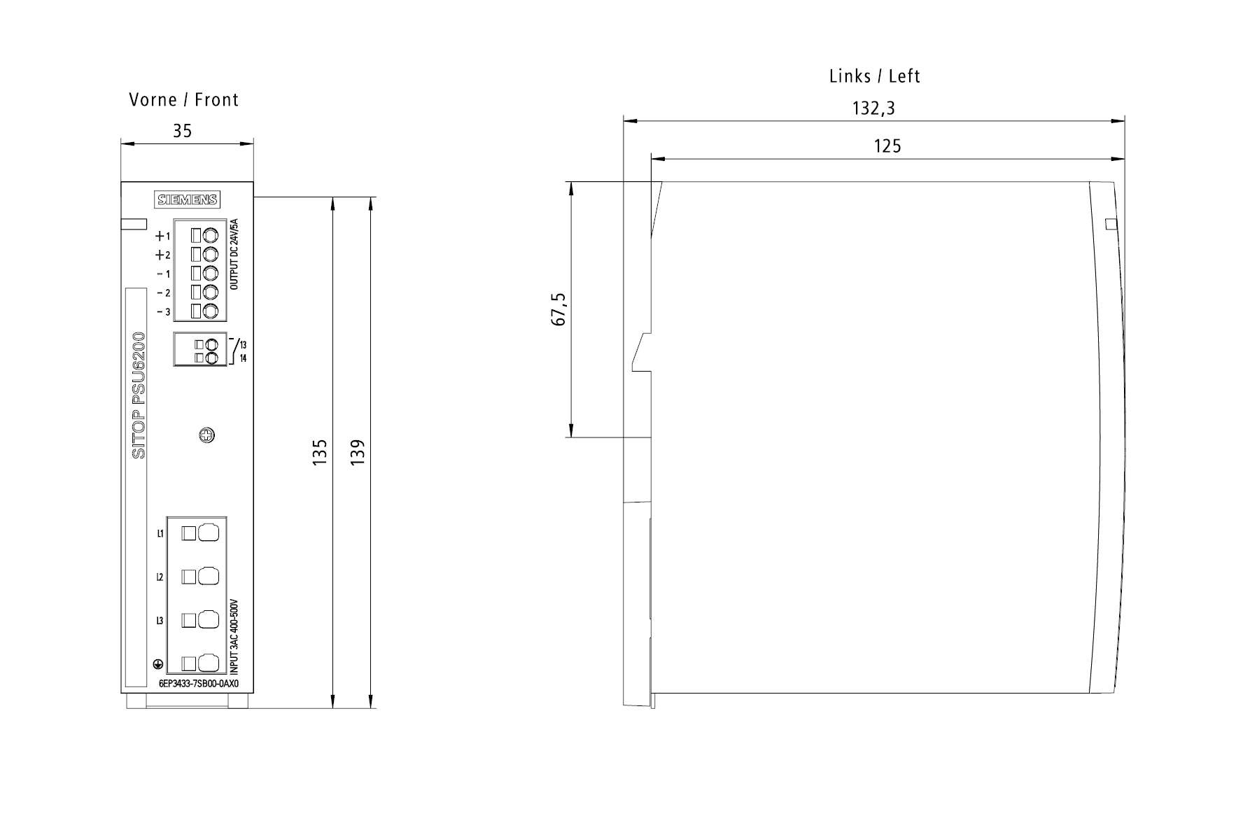 SITOP PSU6200 24 V/5 A alimentatore stabilizzato ingresso: AC 400 - 500 V uscita: DC 24 V/5 A I SITOP PSU6200 trifase sono alimentatori standard per requisiti tecnici elevati. Adatti per molteplici applicazioni, soprattutto nel campo industriale, come adesempio nella costruzione di macchine di serie. Il pregiato design della famiglia PSU6200 insieme ai morsetti push-in assicura un cablaggio efficace. La lunga durata di vita e lassoluta affidabilità potenziano la versatilità dei moduli di questa famigliadi prodotti. Il rendimento elevato in tutto il campo di carico e la riduzione al minimo delle perdite nel funzionamento a vuoto garantiscono un consumo energetico efficiente a salvaguardia delle risorse. Per un ulteriore aumento della disponibilità di 24V, gli alimentatori da rete SITOP PSU6200 possono essere combinati con moduli DC-UPS, di ridondanza e selettivi. Indipendentemente dal settore o dallesigenza, Siemens offre alimentatori affidabili ed efficienti per ogni impianto.