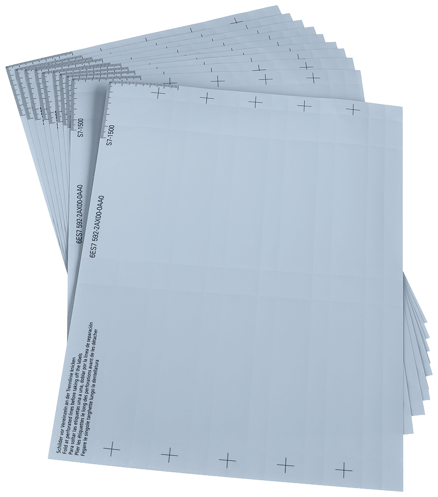 SIMATIC S7-1500, fogli di etichette di siglatura per unità S7-1500 con larghezza 35 mm colore: AL GREY materiale: pellicola, perforato; indonei alla stampa con le stampanti laser disponibili in commercio; 10 fogli da 10 etichette per unità dimballo sufficienti per 100 unità Accessori per moduli S7-1500