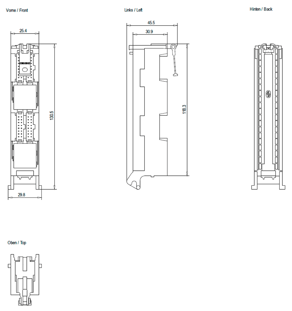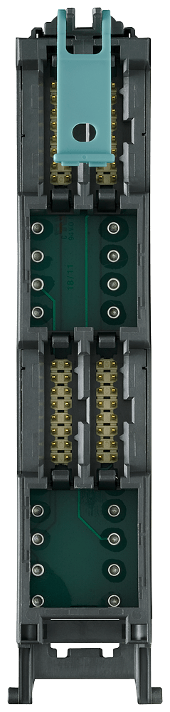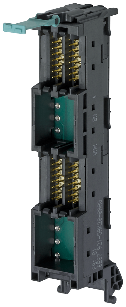 modulo connettore frontale con 4 x 16 poli connessione IDC per analogiche unità I/O dellS7-1500 a 40 poli alimentazione di potenziale tramite elemento di alimentazione Il modulo connettore frontale per SIMATIC S7-1500 per il collegamento di cavi a 16 poli è un connettore frontale modificato per il collegamento ad una unità I/O analogica. Questo viene innestato sullunità da cablare al posto del connettore frontale. Qui vengono innestati lelemento di alimentazione ed i cavi di collegamento e quindi collegati con il modulo di connessione. Questo modulo connettore frontale modificato è parte integrante del collegamento completamente modulare di SIMATIC TOP connect per il cablaggio di sistema più rapido e più sicuro. Oltre ad un ridotto onere di cablaggio è possibile una riduzione significativa delle fonti di errori. I segnali analogici della periferia vengono addotti ai moduli di connessione di SIMATIC TOP connect e da questi, tramite cavo di collegamento e modulo connettore frontale, collegati con il SIMATIC S7-1500.
